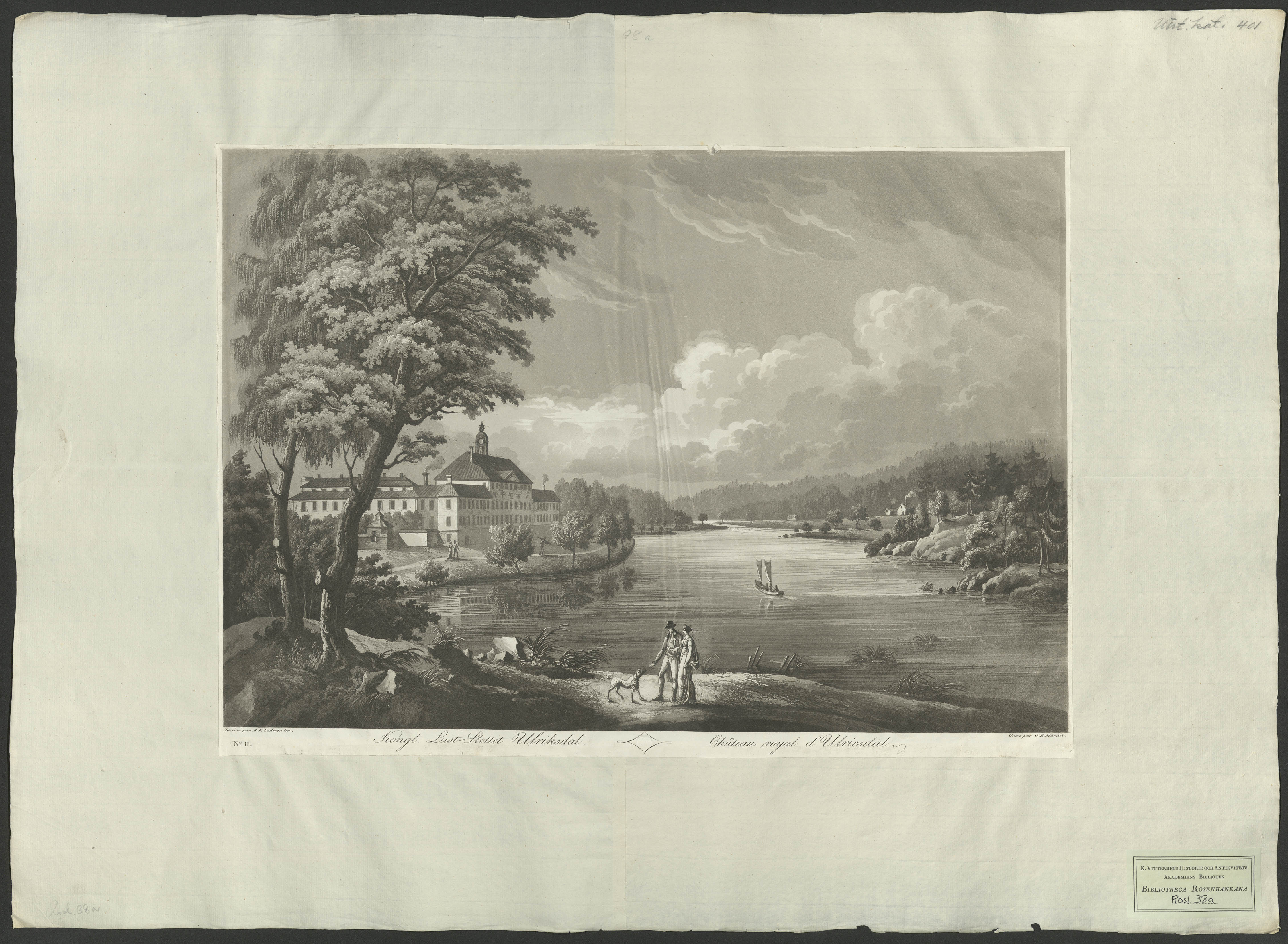 Beskrivning: 1 grafiskt bl. : Landskapsvy med slottet till vänster i bild. I förgrunden ett par med en hund. Dessiné par A. F. Cederholm ; Gravé par J. F. Martin.