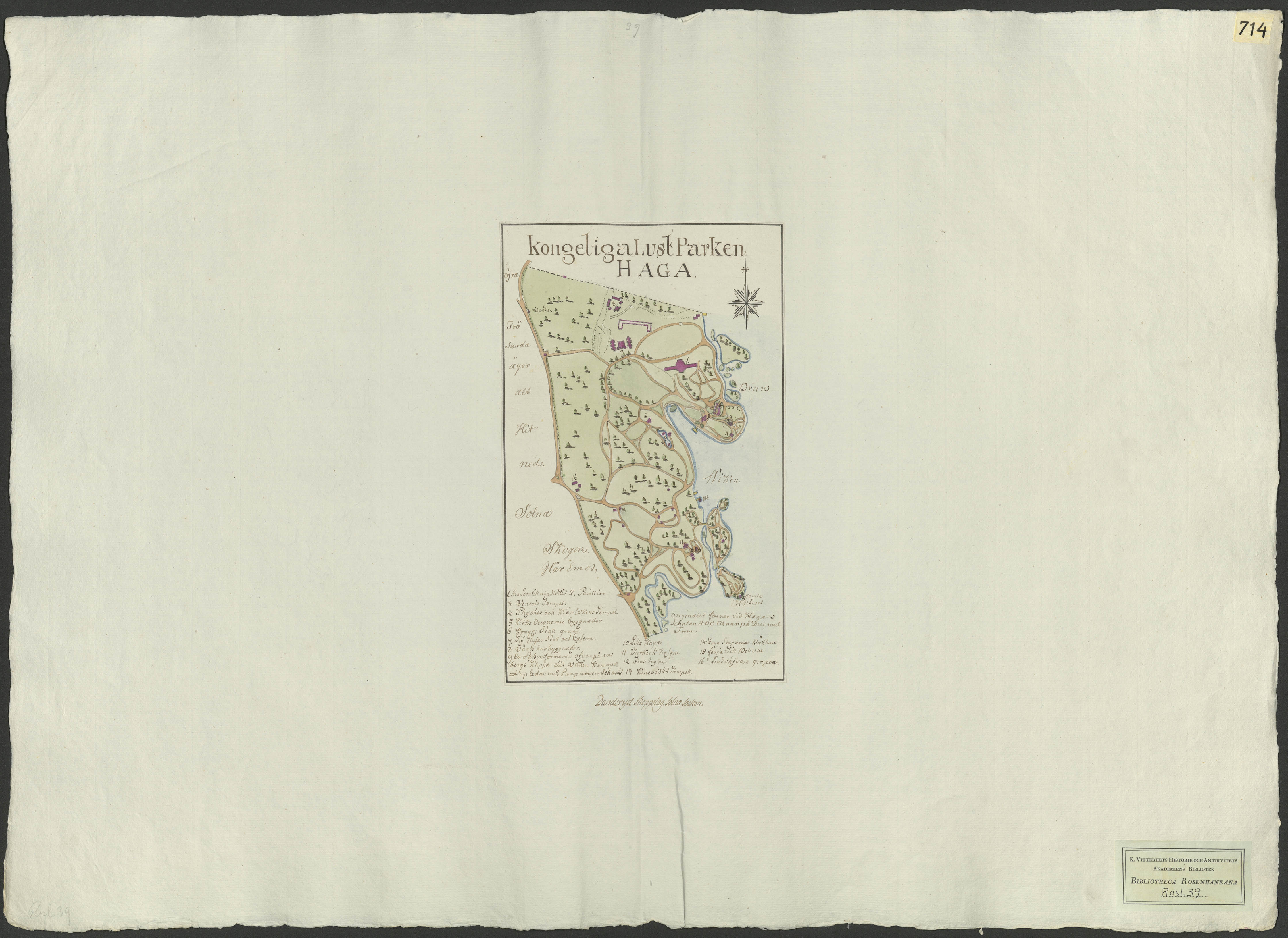 Beskrivning: 1 handritad karta : Hagaparkens stigar och byggnader utmärkta. Teckenförklaring. Nordpil.