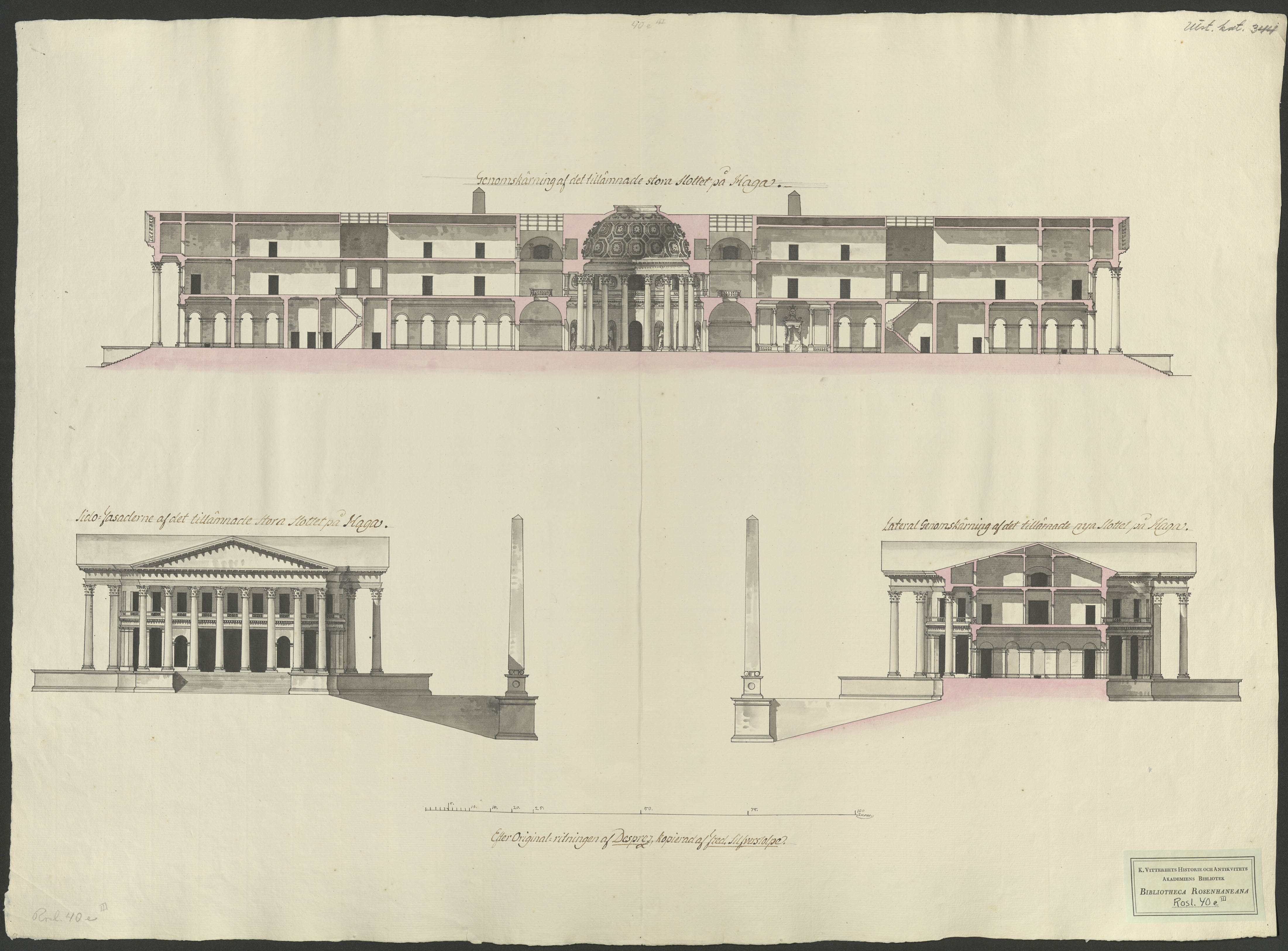 Beskrivning: 1 bl. : Arkitekturritning av Haga slott. Genomskärning från långsidan samt från gaveln, samt ritning av gavelfasaderna. Skala 1 cm = 4 alnar.