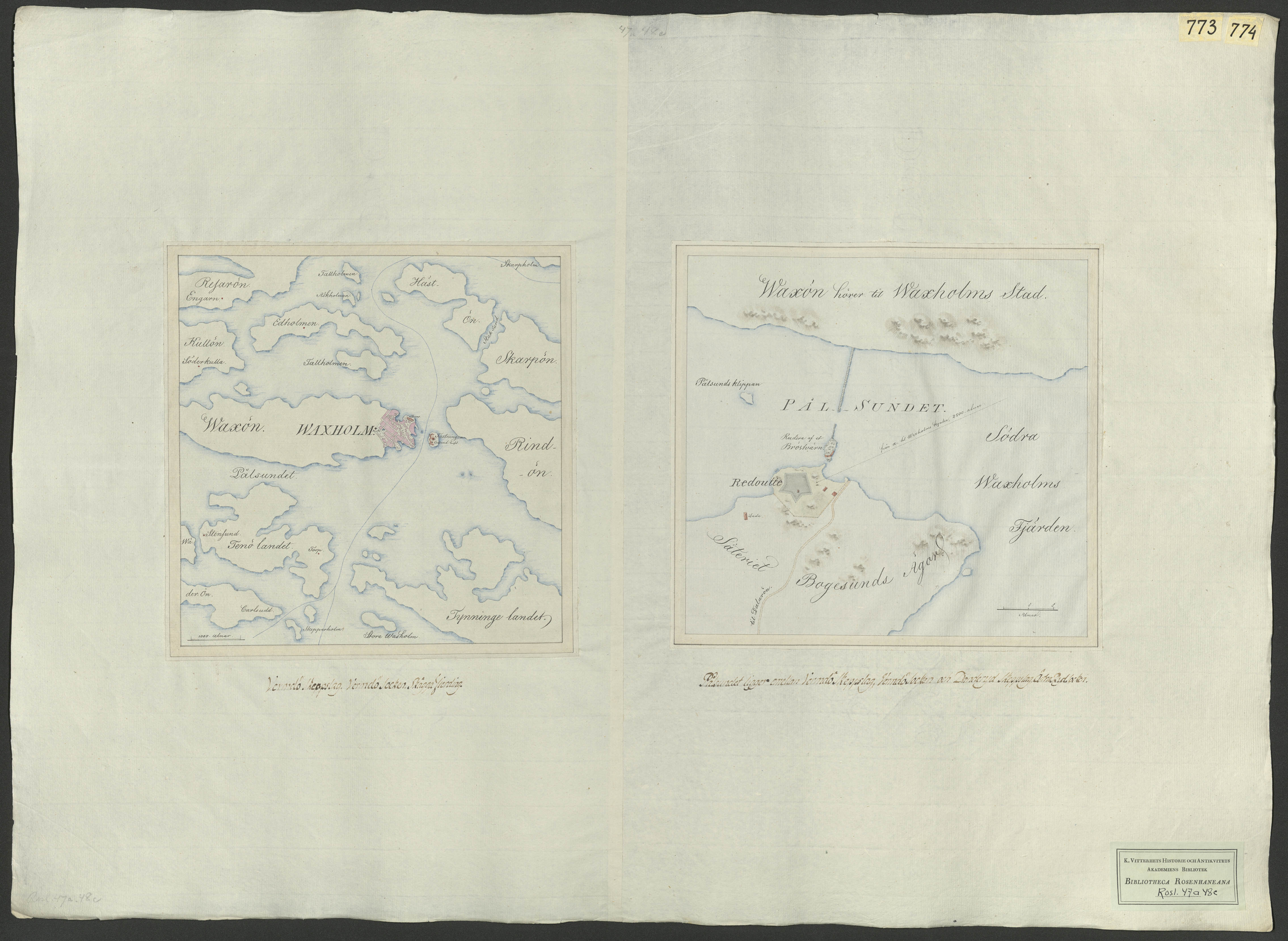 Beskrivning: 1 handritad karta : Visar Vaxholm och trakten däromkring. Skala 1 cm = 330 alnar.