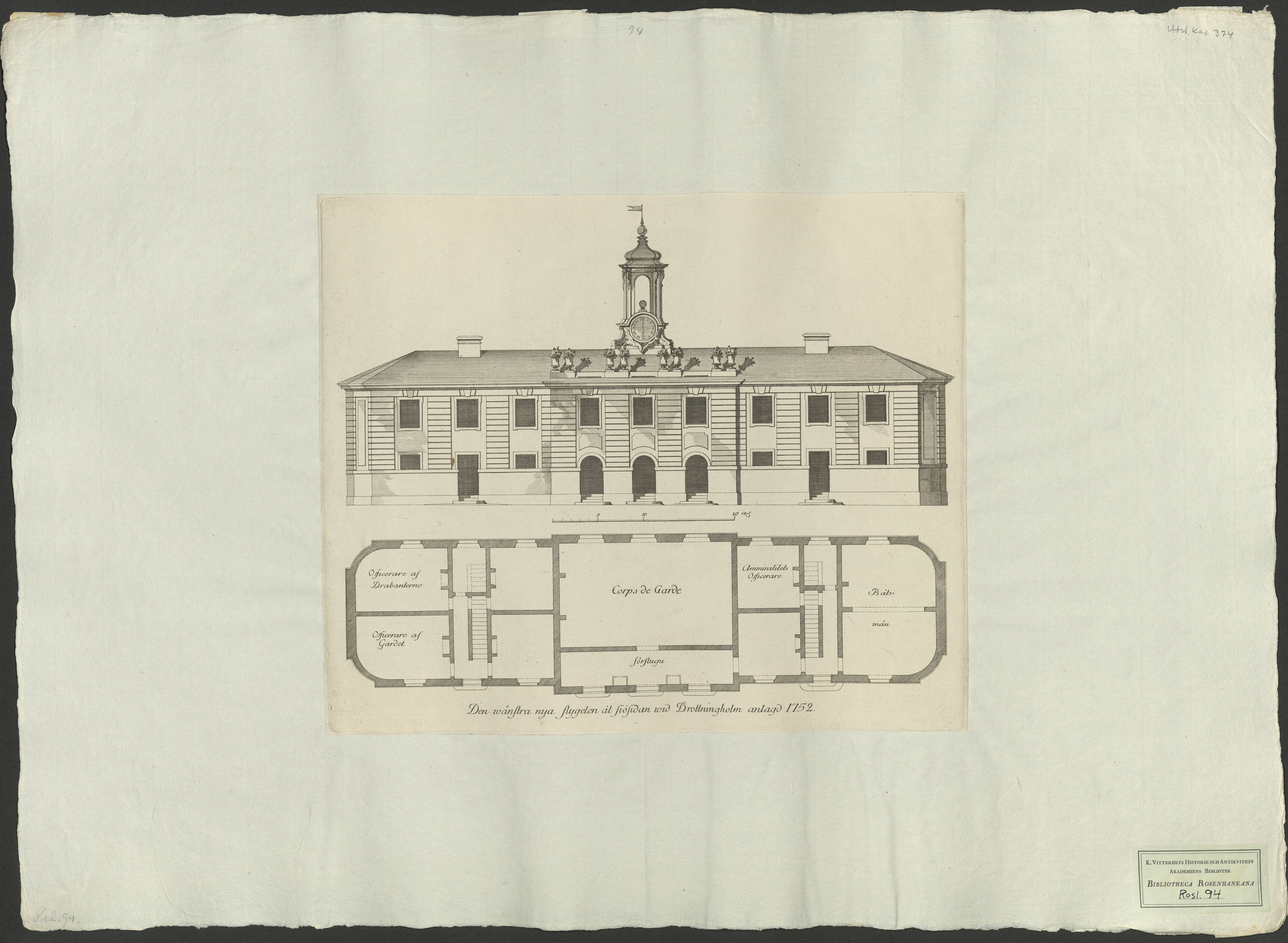 Beskrivning: 1 grafiskt bl. : Arkitekturritning. Fasad och plan. Skala 1 cm = ca 2 alnar.