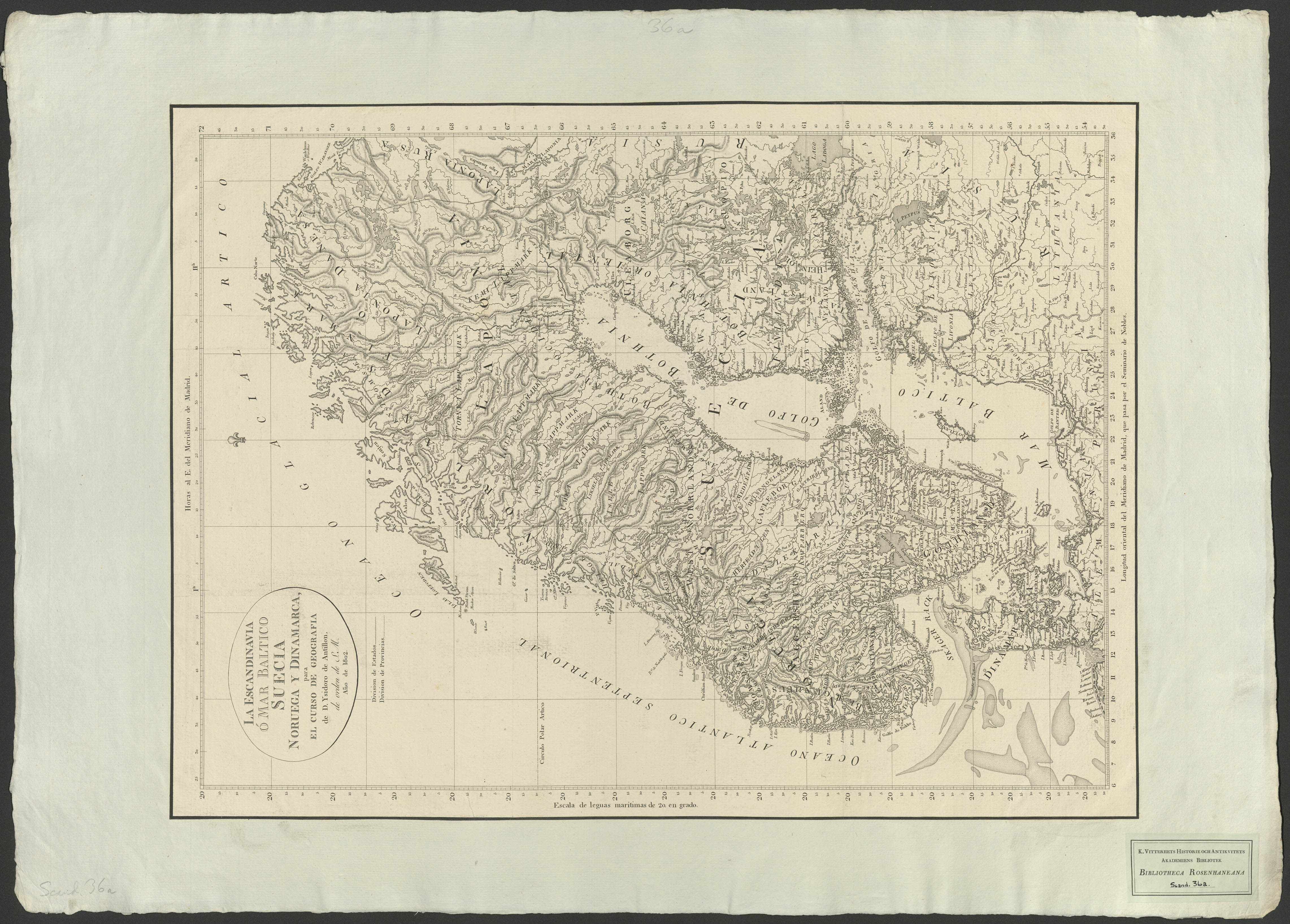 Beskrivning: 1 karta : Visar Skandinavien, Finland samt Baltikum. Mercators projektion. Nollmeridian Madrid. Ysidoro de Antillon