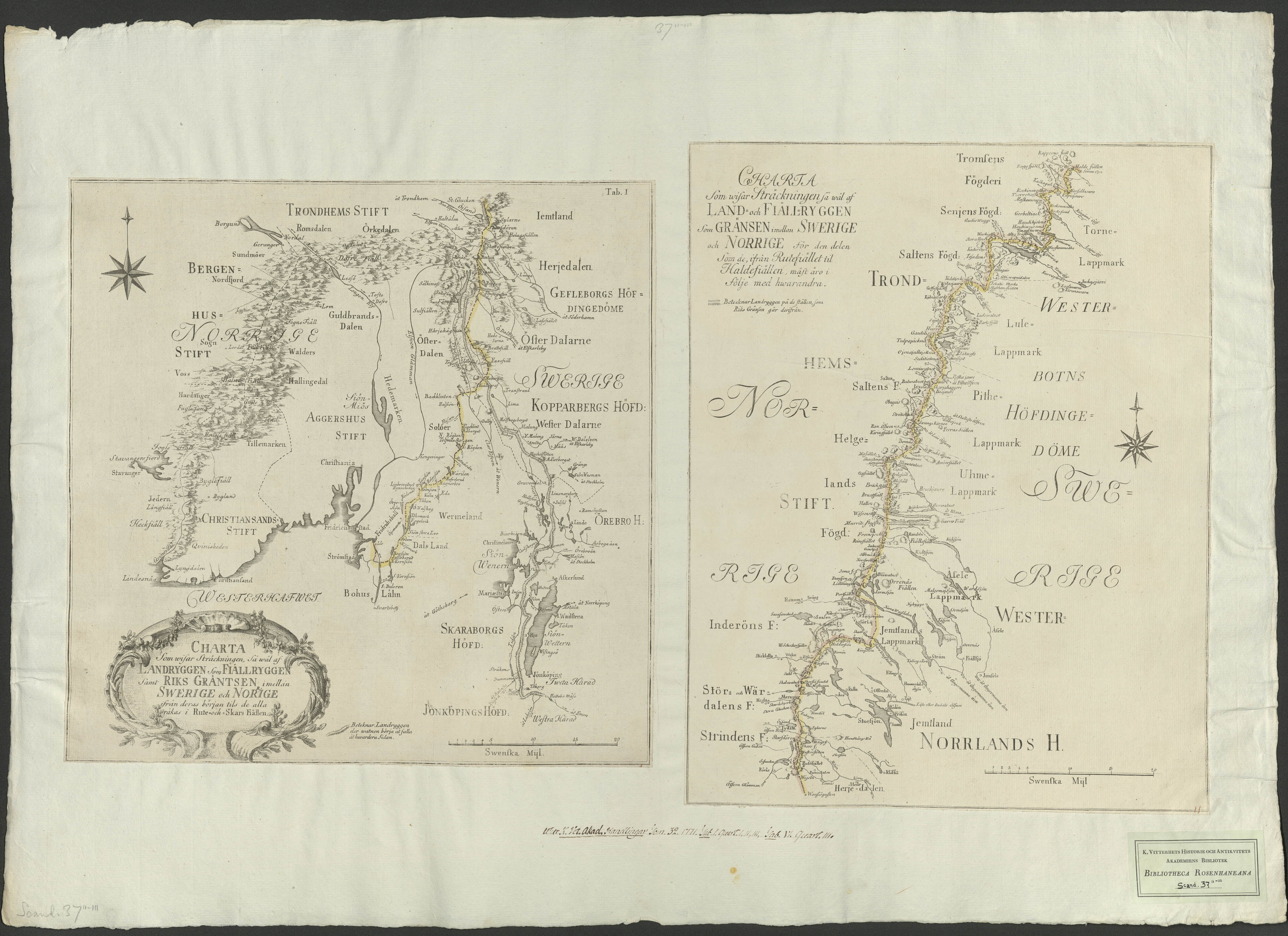 Charta som wisar sträckningen såwäl af land- och fiäll-ryggarne, samt Riks Gräntsen i mellan Swerige och Norrige ifrån deras början tils de alla råkas i Rute- och Skars Fiällen..[Kartografiskt material]