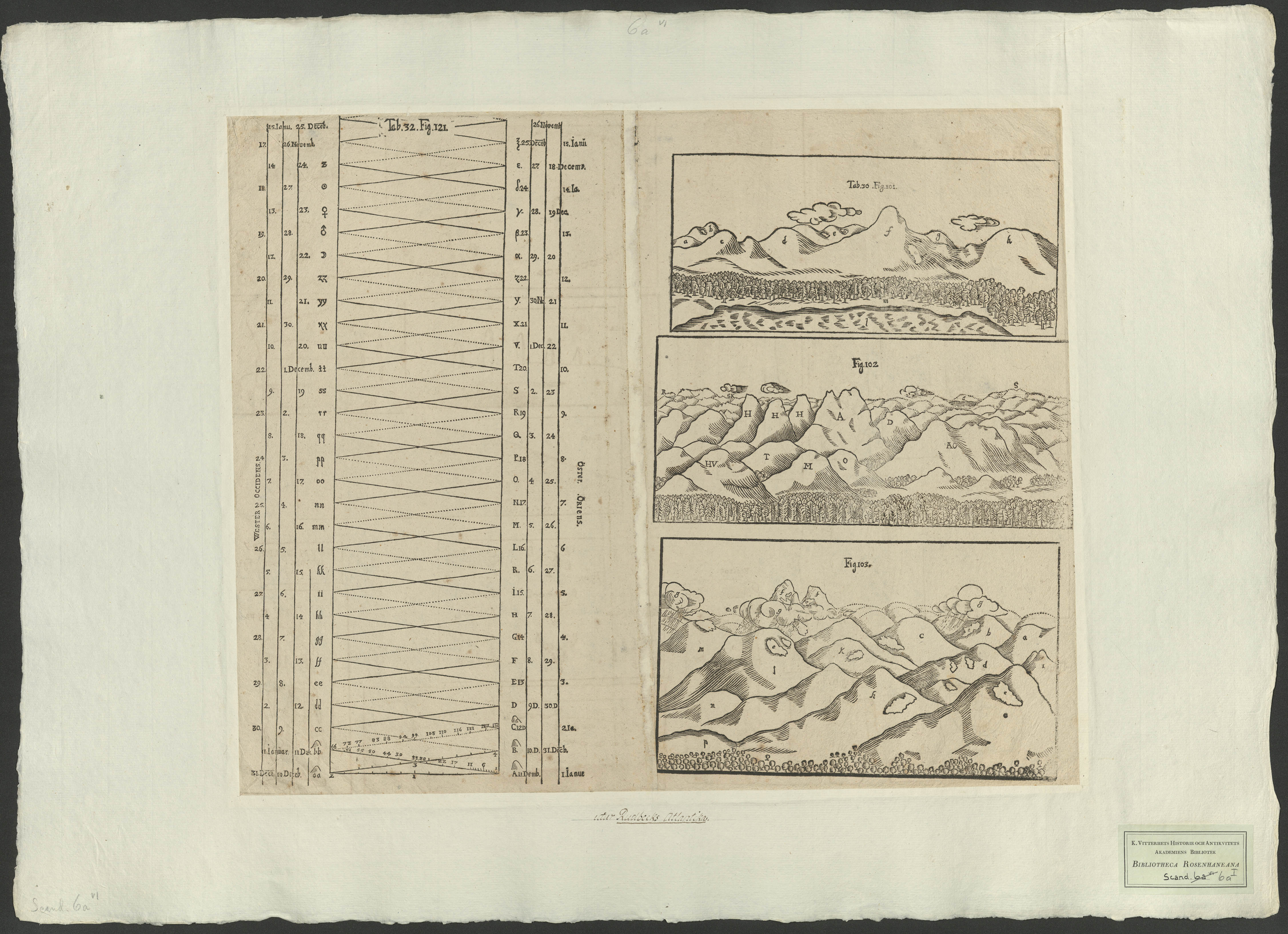 Beskrivning: 1 grafiskt bl. : En tabell samt tre teckningar över bergsmassiv.