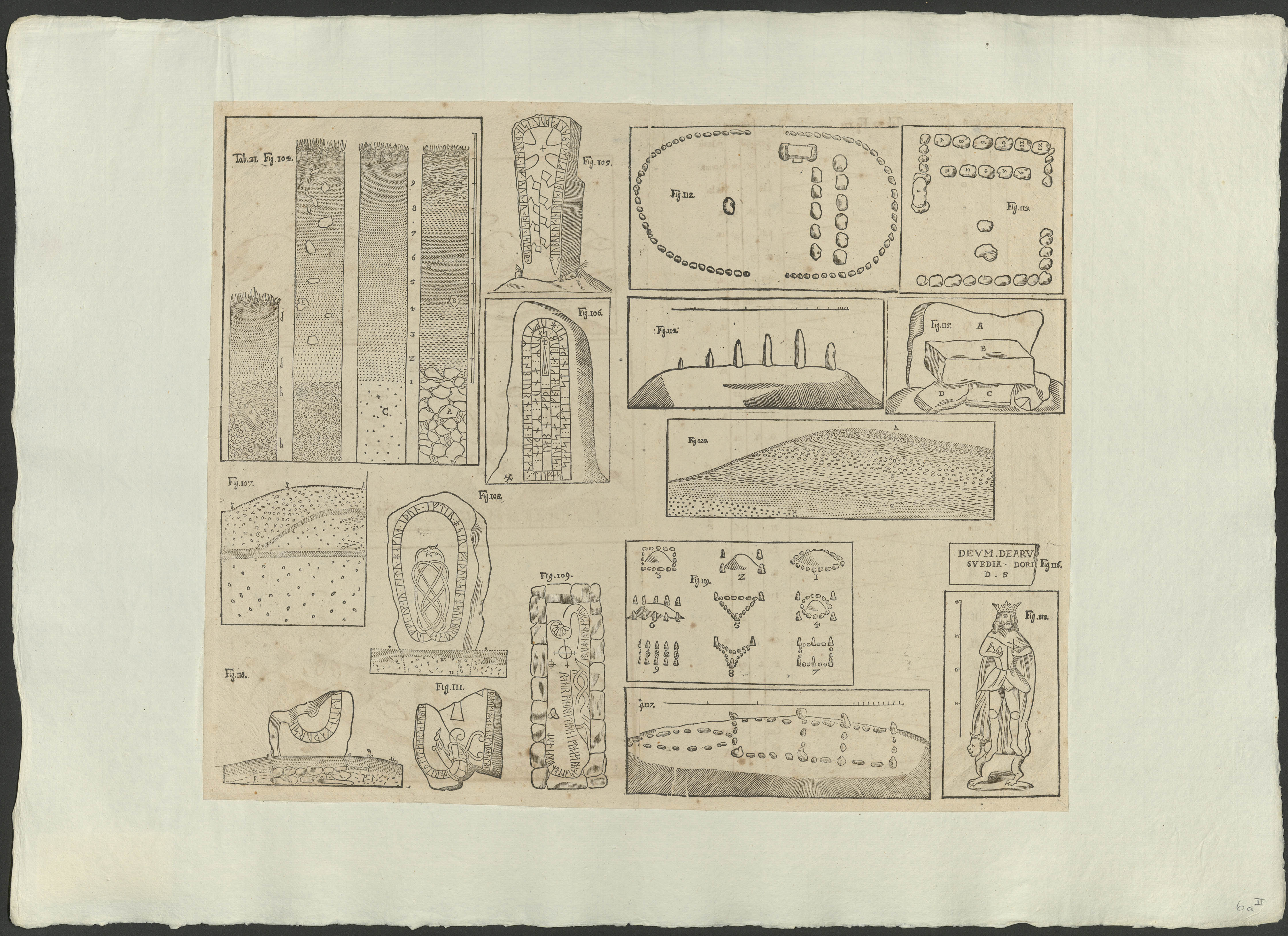 Beskrivning: 1 grafiskt bl. : Teckningar av runristningar och stensättningar.