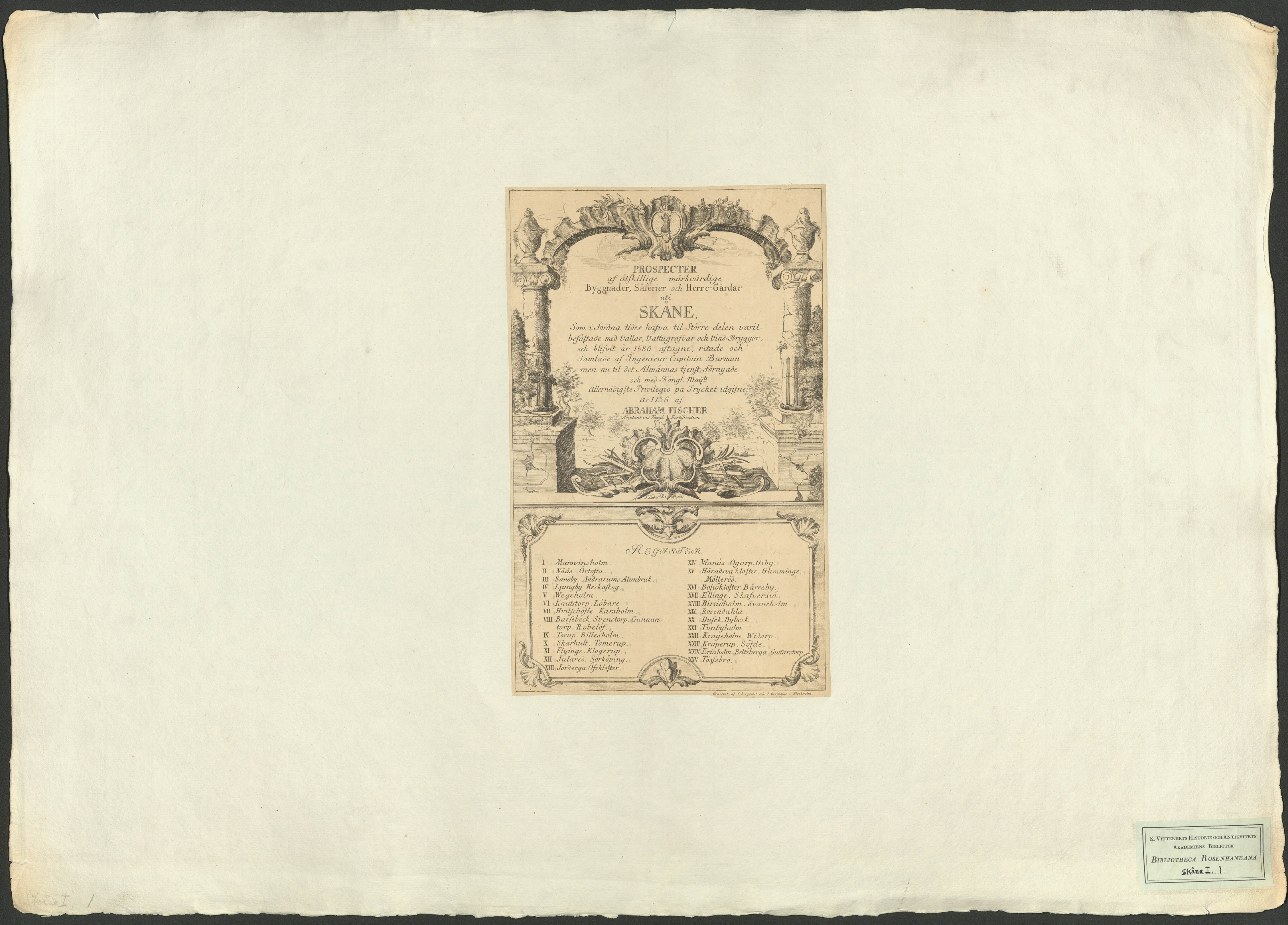 [Titelsida till Prospecter af åtskillige märkvärdige Byggnader, Säterier och Herreågärdar uti Skåne.].[Bild]