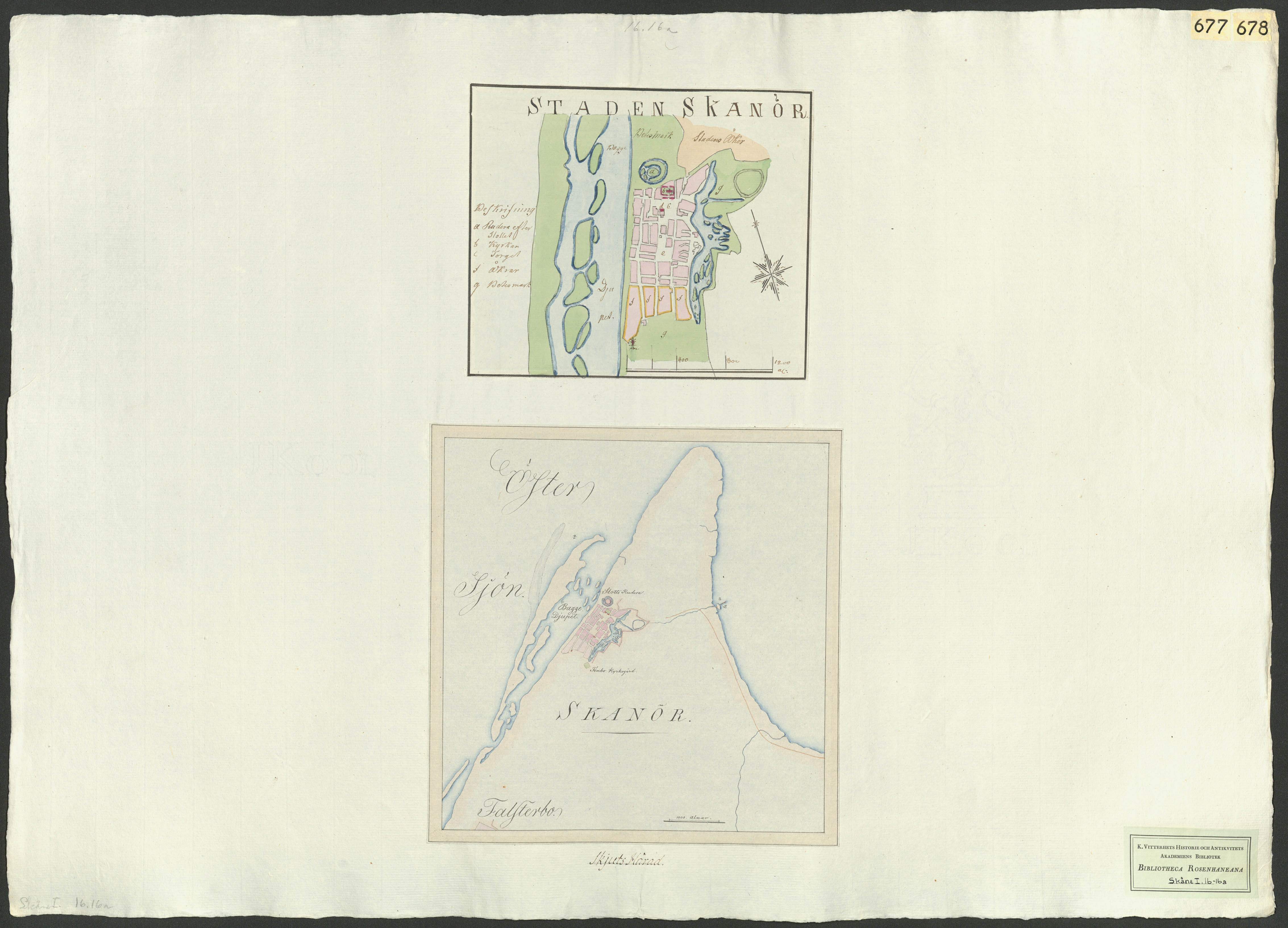 Beskrivning: 1 handritad karta : Visar stadskvarteren och närmaste omnejd. Teckenförklaring. Nordpil. Ungefärlig skala 1:7 800.