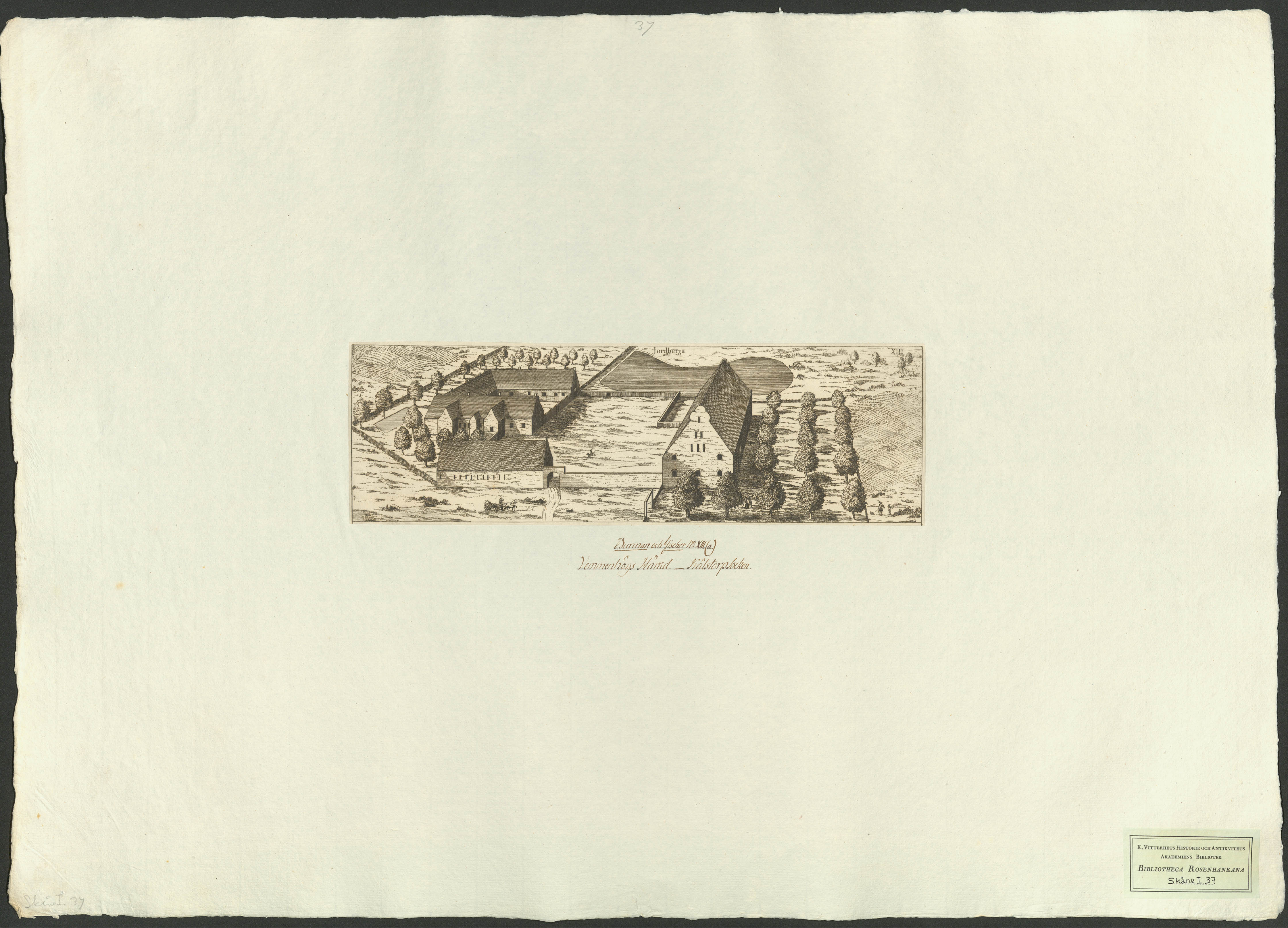 Beskrivning: 1 grafiskt bl. : Teckning i fågelperspektiv av slottsanläggningen.