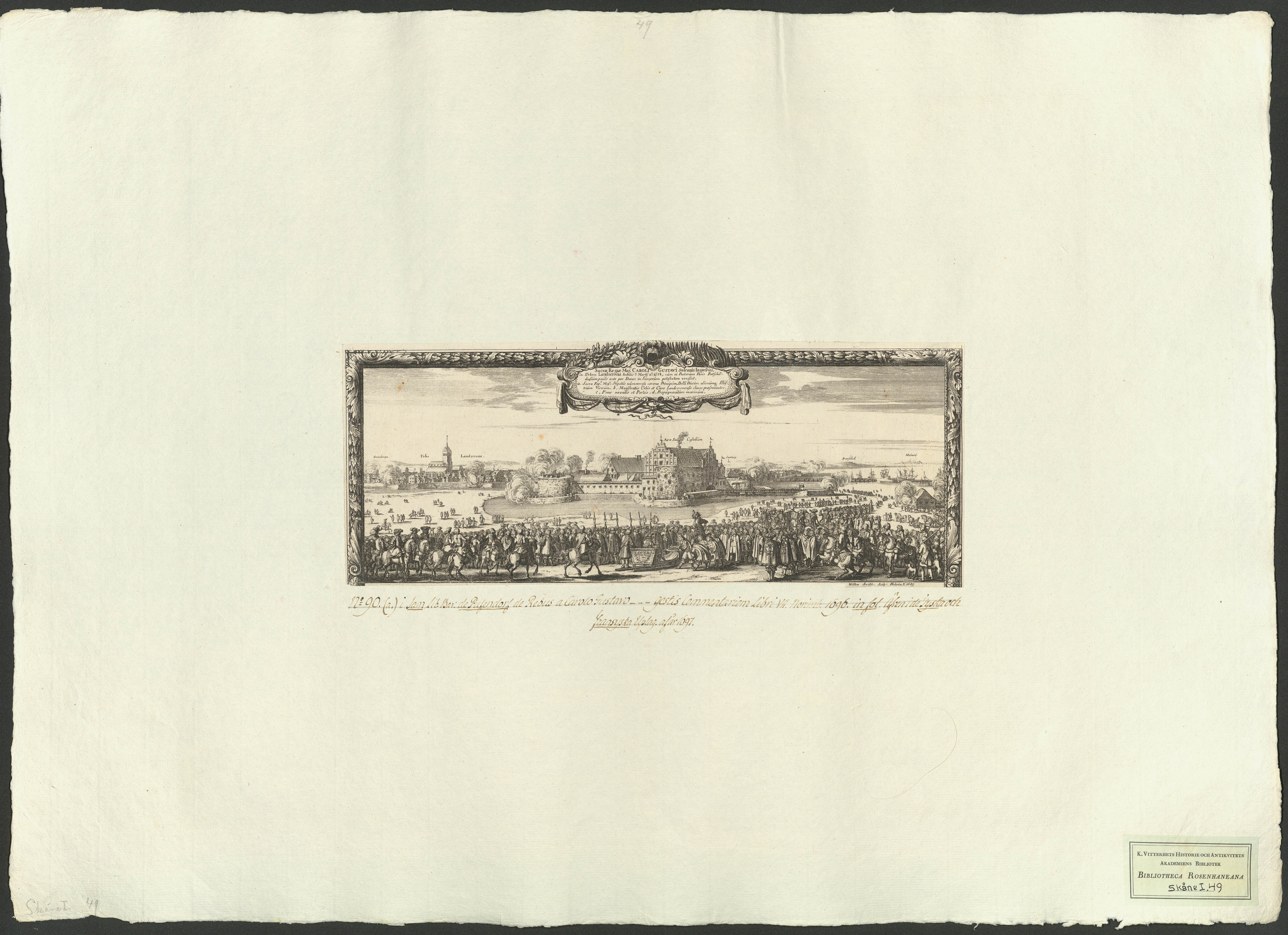 Beskrivning: 1 grafiskt bl. : Panorama över Landskrona. I förgrunden den svenska kungen i en släde och med uppvaktning. Willem Swidde Sculp. Holmiæ A. 1689.
