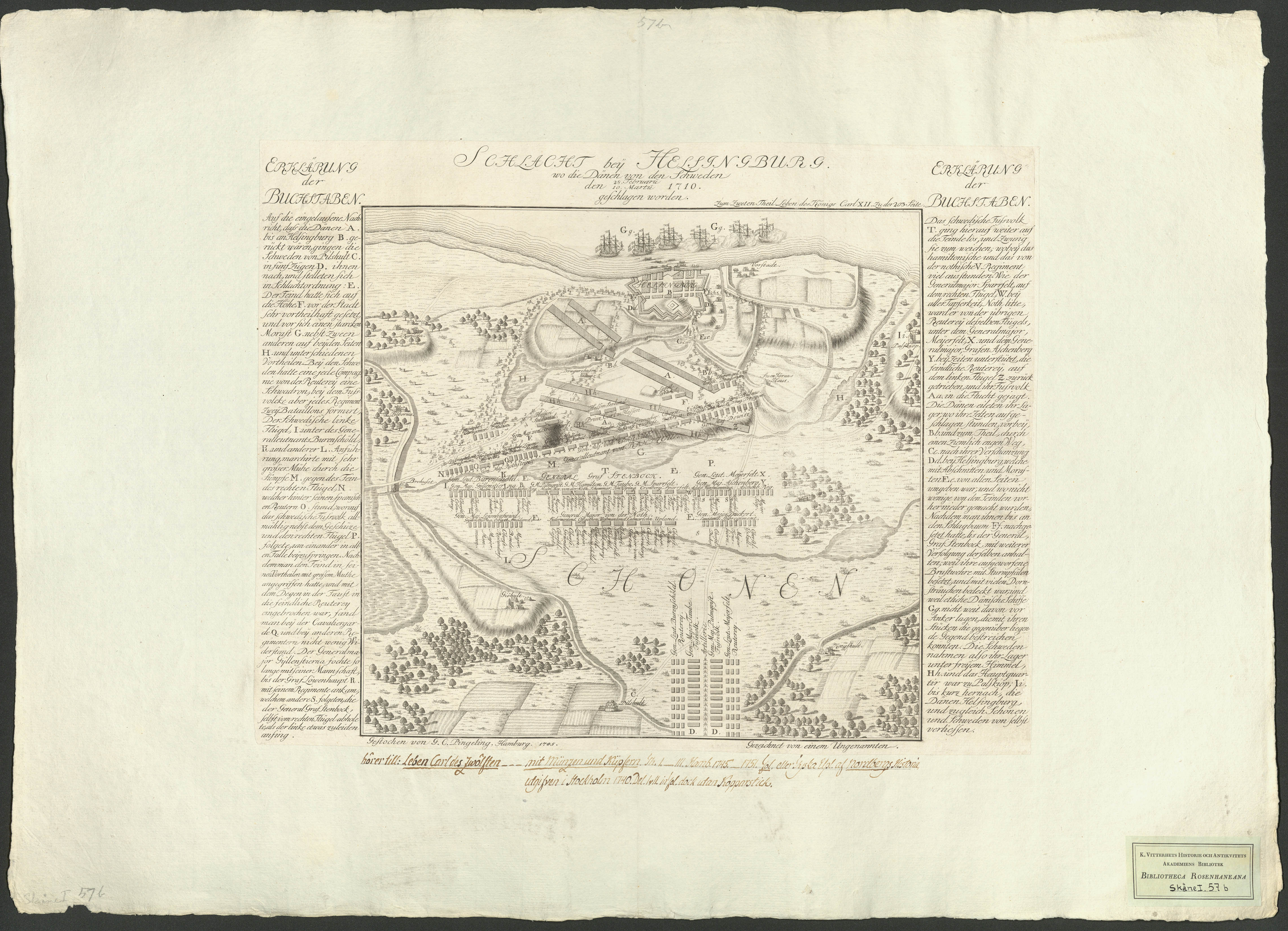 Beskrivning: 1 karta : Topografisk plansch över slagfältet och Helsingborg. I vänsterkant förklaring över truppuppställningarna. I högerkant teckenförklaring. Gestochen von G. C. Pingeling Hamburg 1745