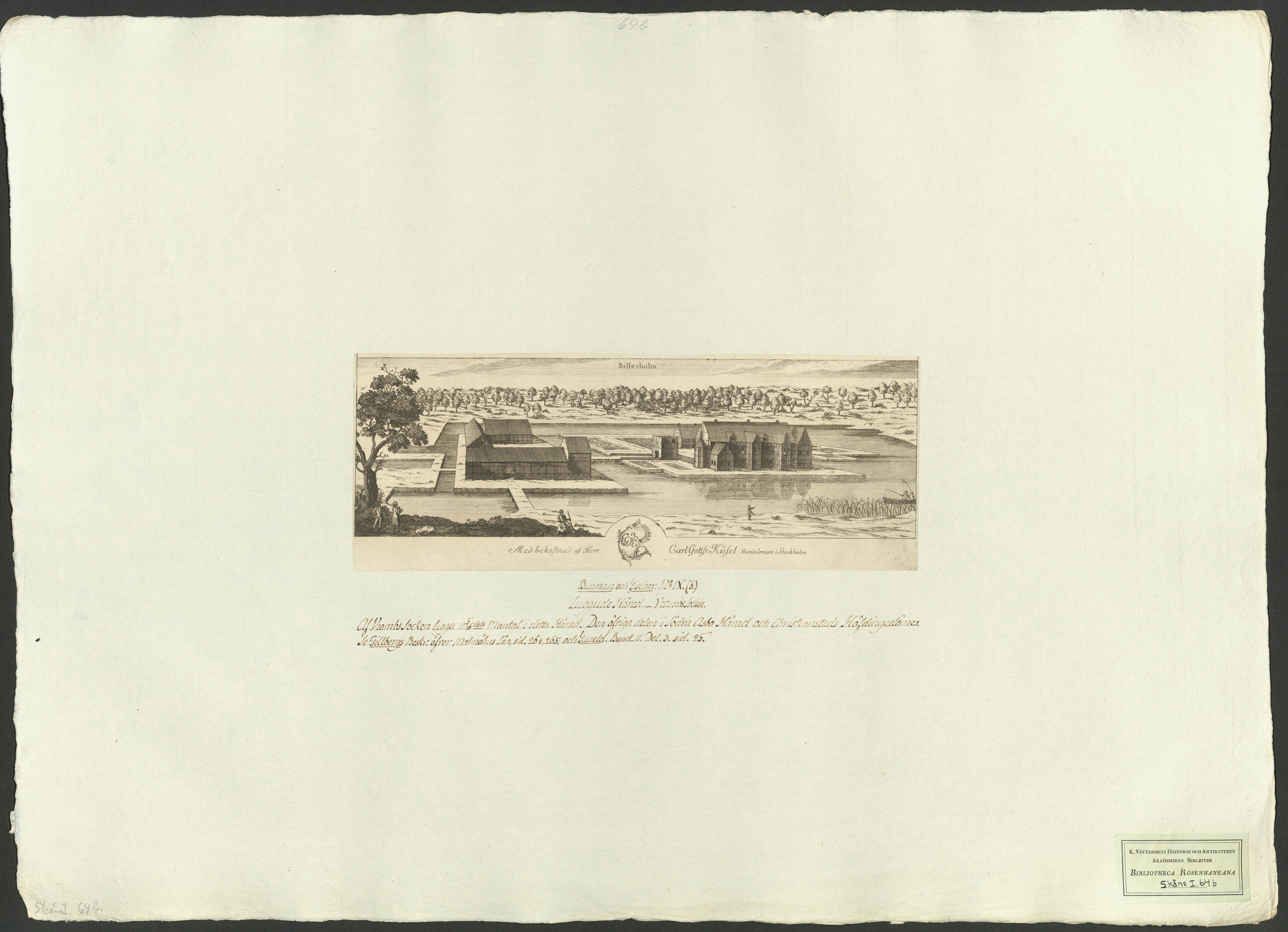 Beskrivning: 1 grafiskt bl. : Teckning i fågelperspektiv av kungsgården.