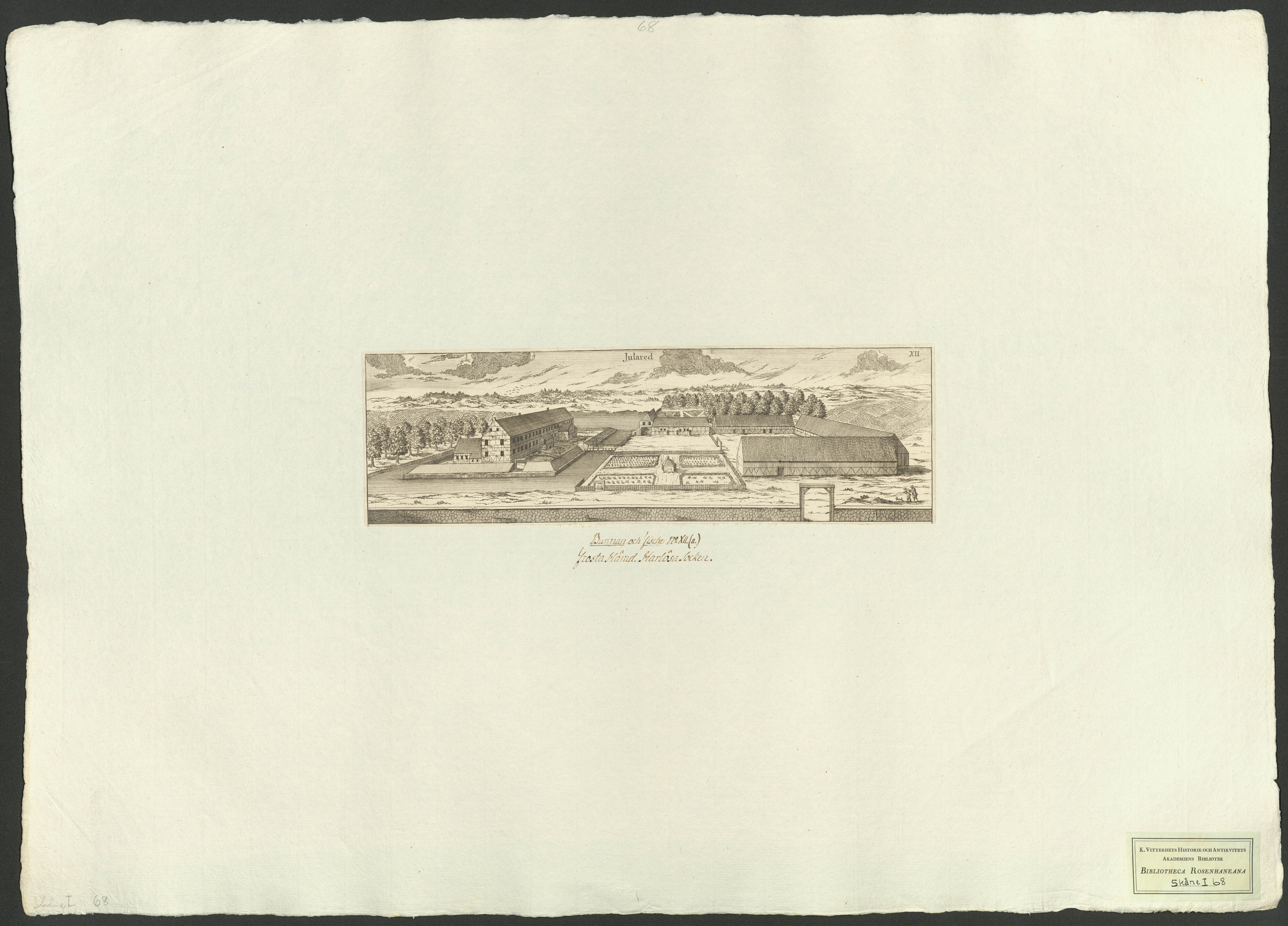 Beskrivning: 1 grafiskt bl. : Teckning i fågelperspektiv av slottsanläggningen.