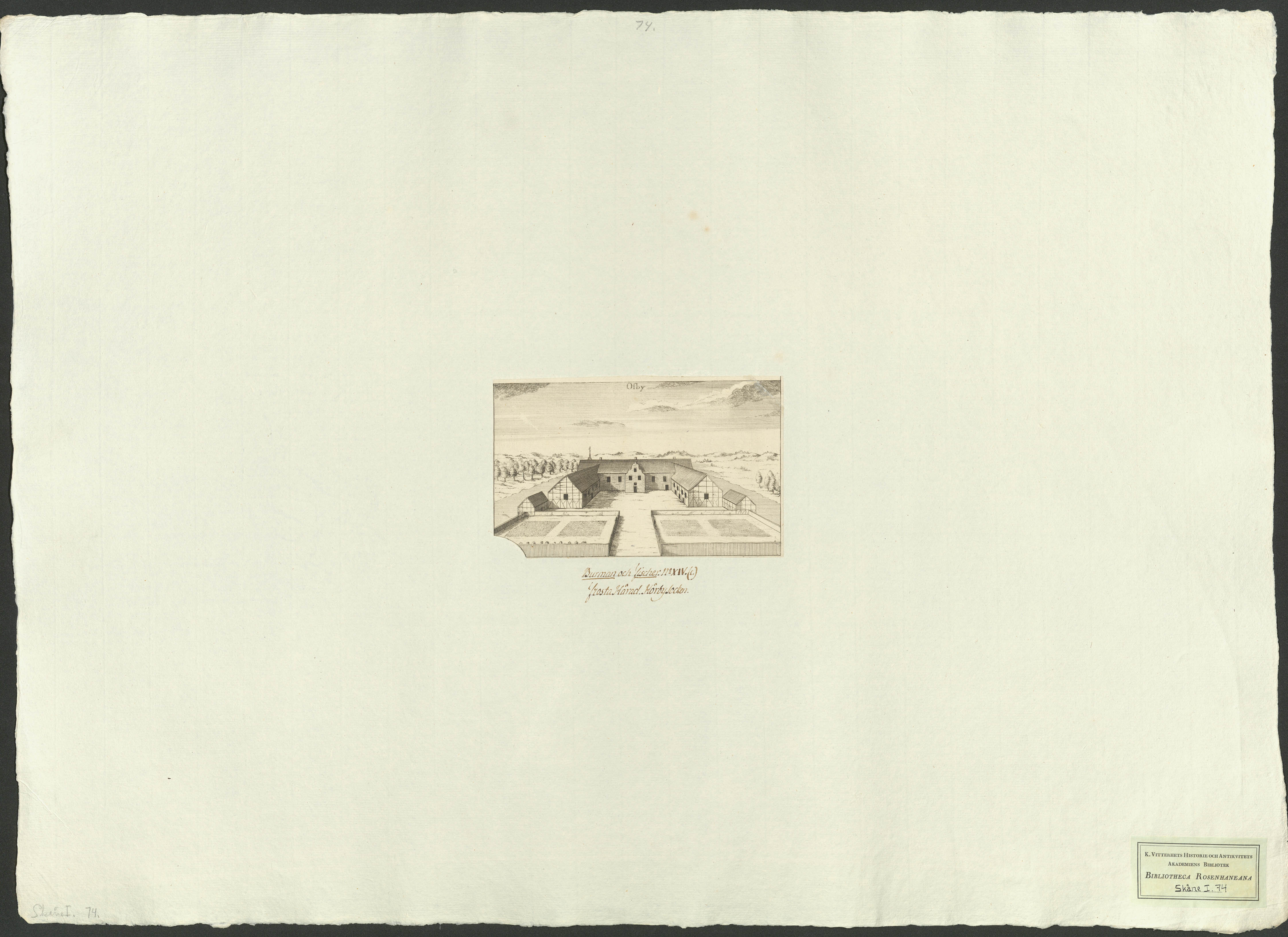 Beskrivning: 1 grafiskt bl. : Teckning i fågelperspektiv av slottsanläggningen.