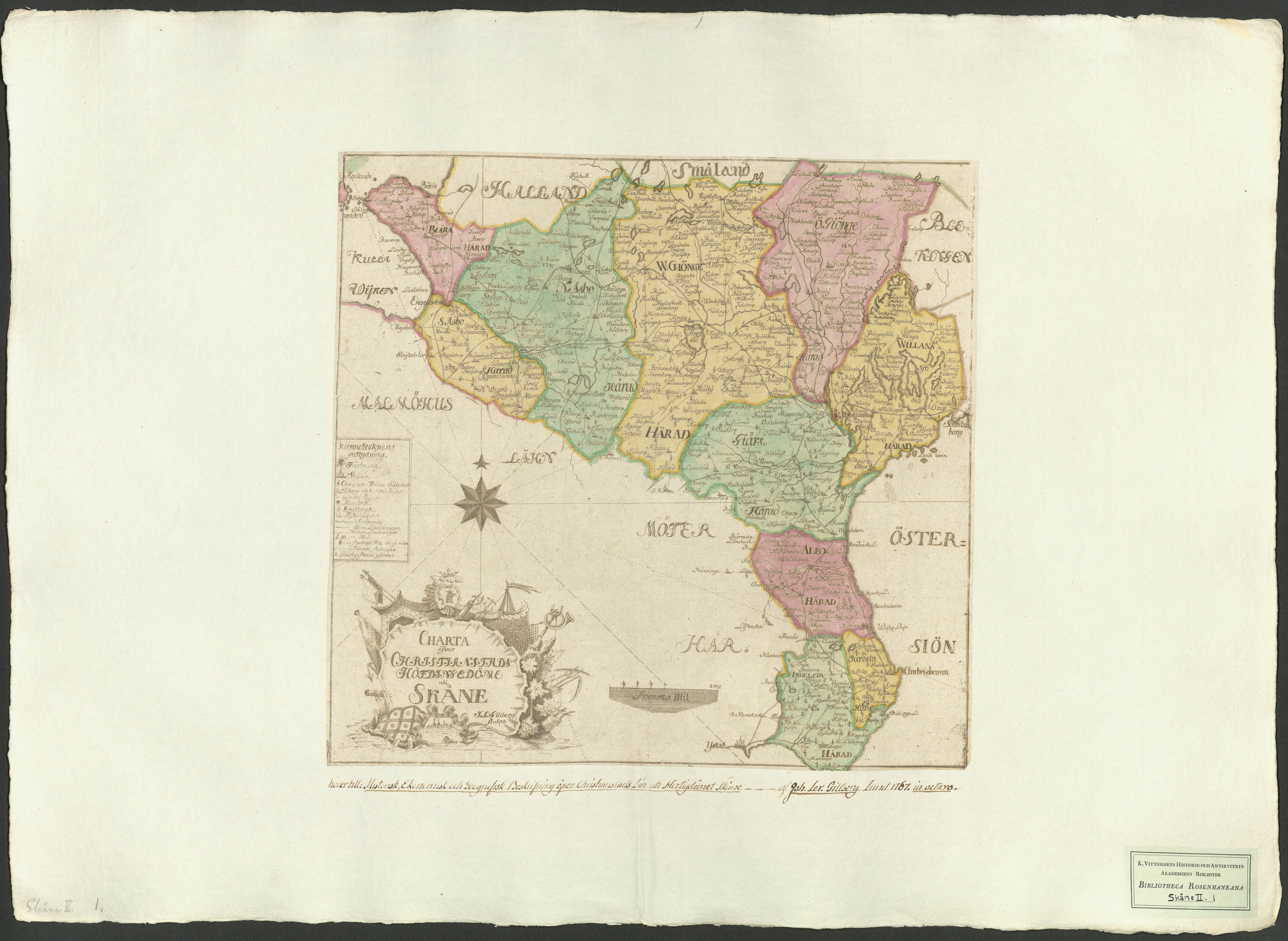 Beskrivning: 1 karta : Häraderna kolorerade. Skala i svenska mil. Ungefärlig skala 1:300 000. J. L. Gillberg Sculps.
