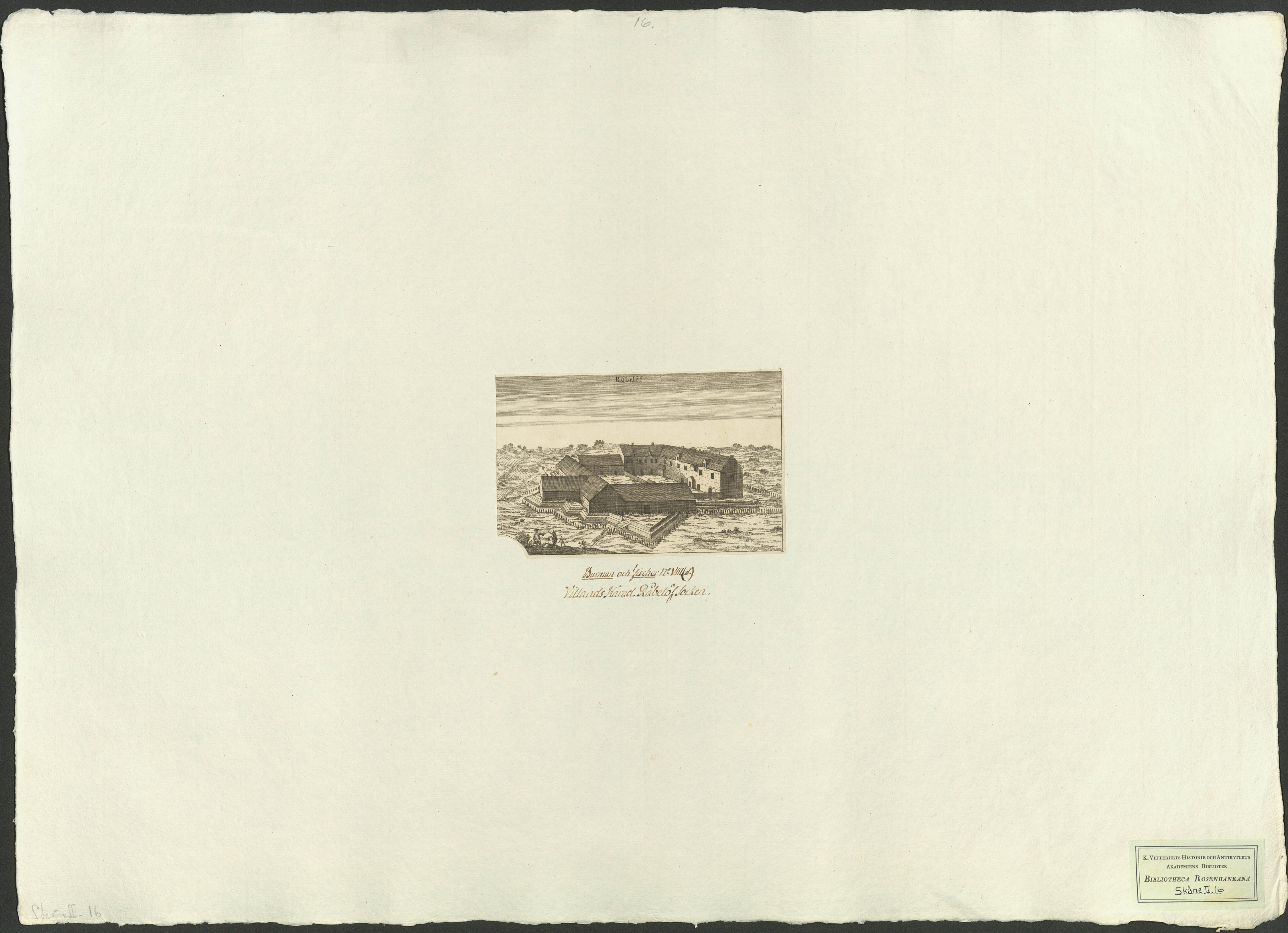 Beskrivning: 1 grafiskt bl. : Teckning i fågelperspektiv av slottsanläggningen.