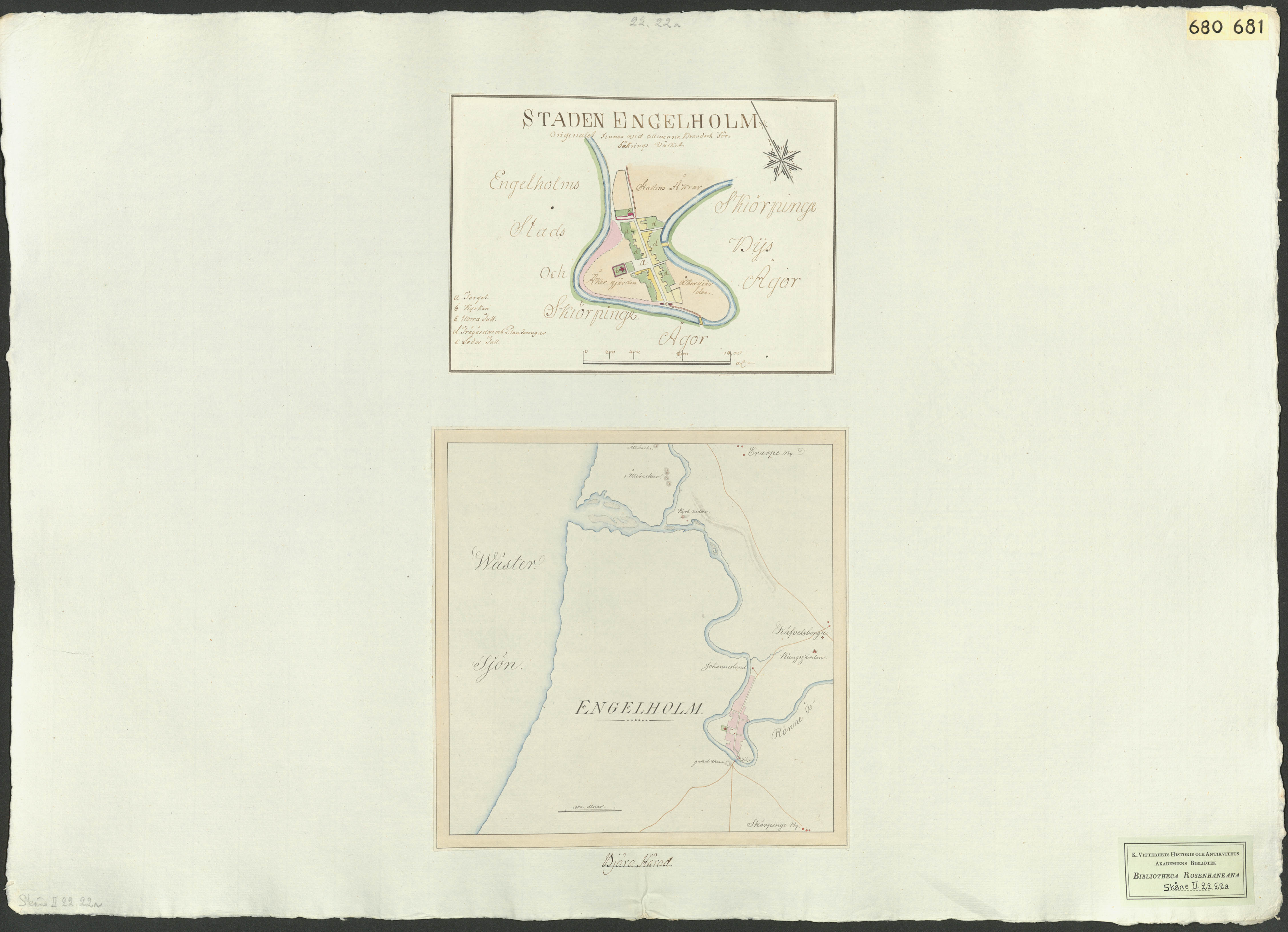 Beskrivning: 1 handritad karta : Visar stadskvarteren om stadens närmaste omland.