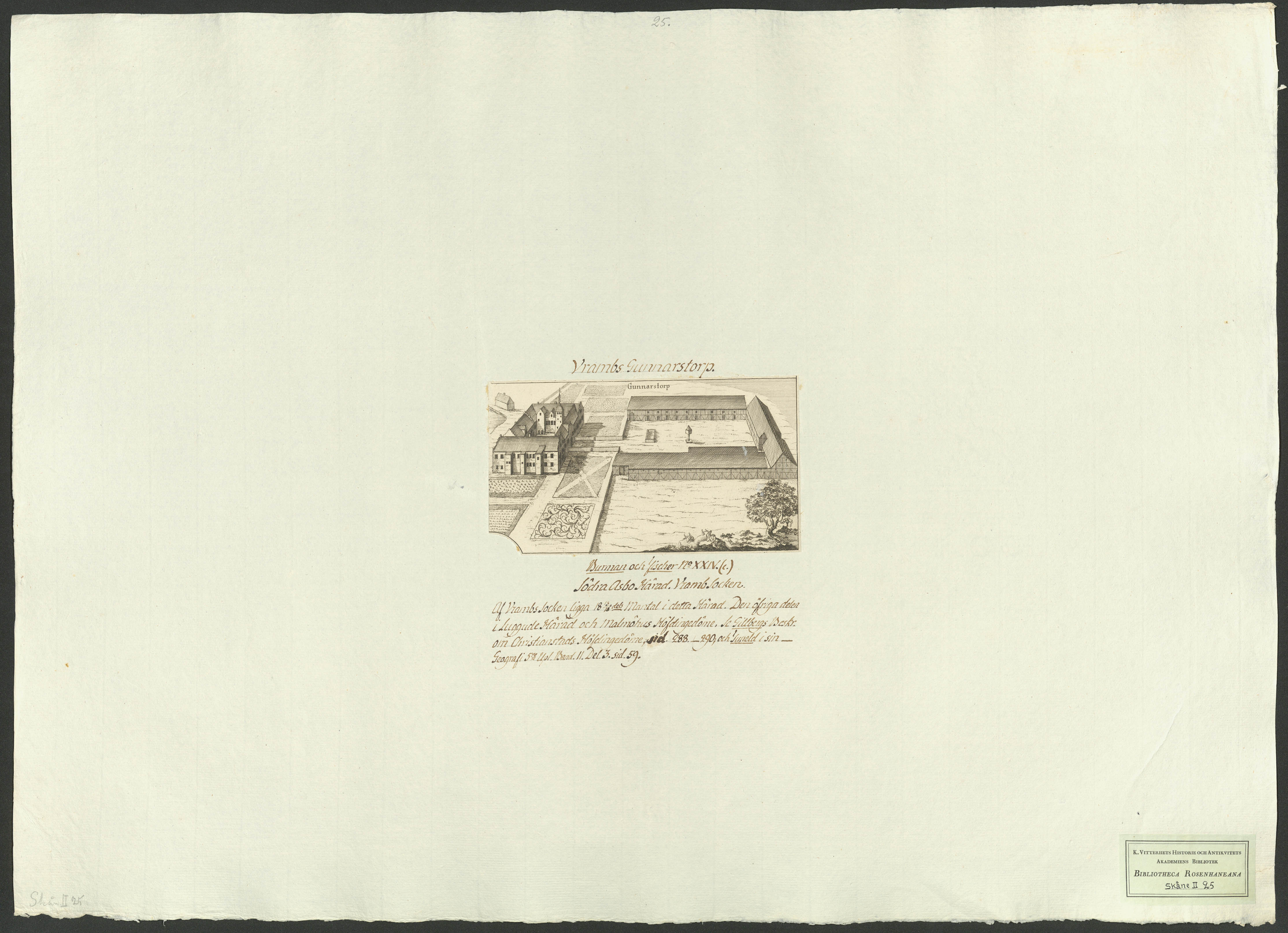 Beskrivning: 1 grafiskt bl. : Teckning i fågelperspektiv av slottsanläggningen.