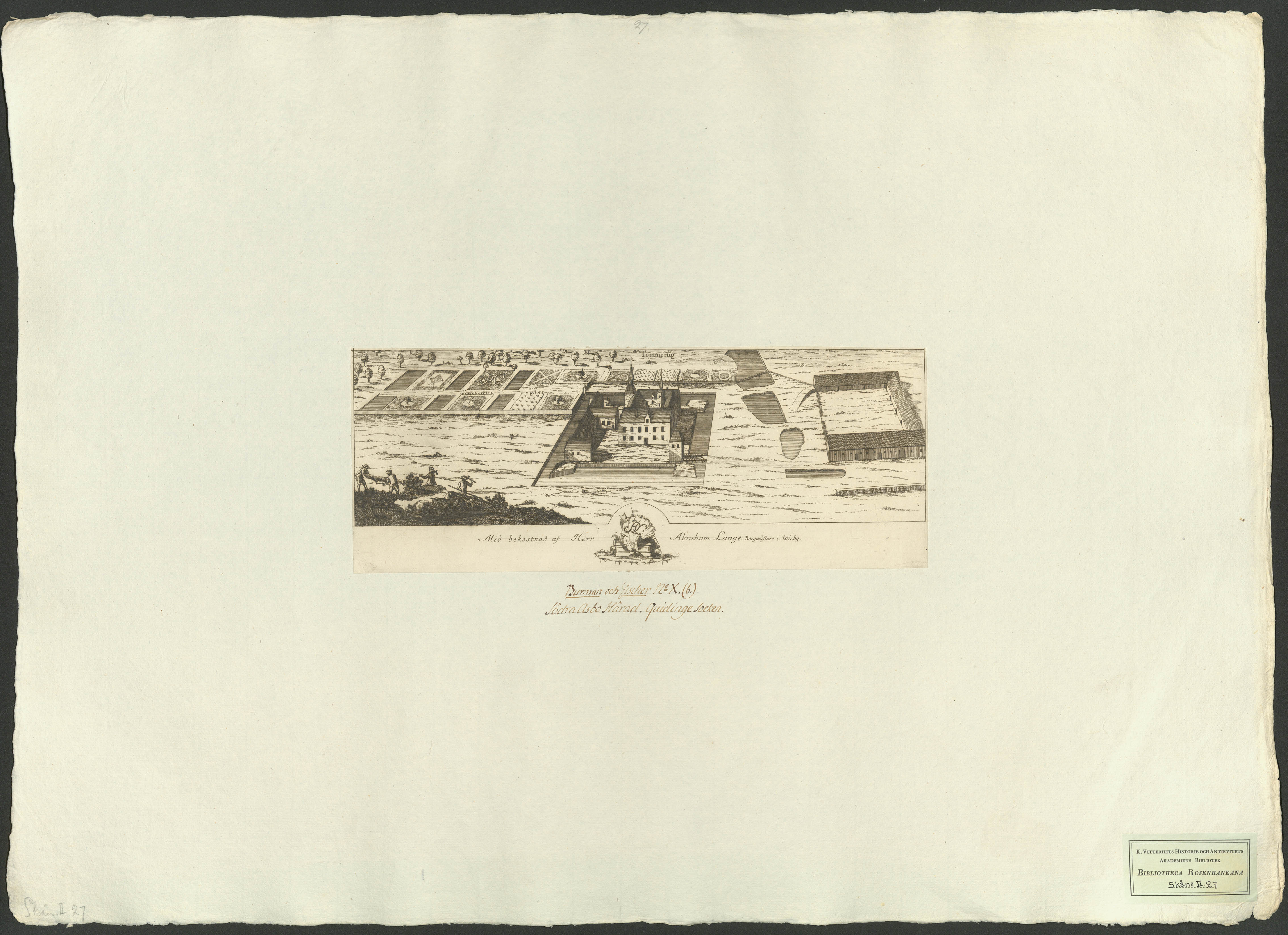 Beskrivning: 1 grafiskt bl. : Teckning i fågelperspektiv av slottsanläggningen.