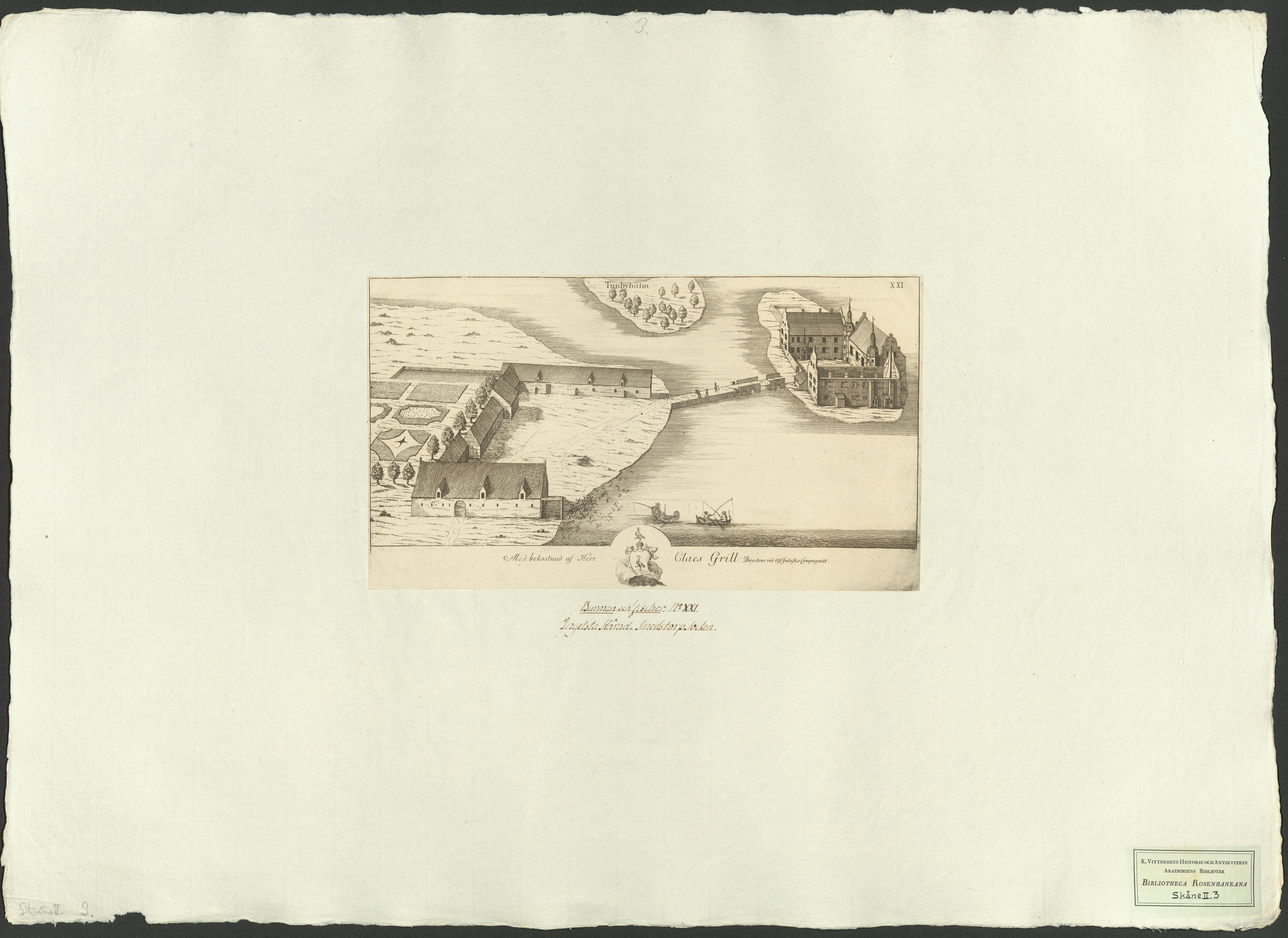 Beskrivning: 1 grafiskt bl. : Teckning i fågelperspektiv av slottsanläggningen.