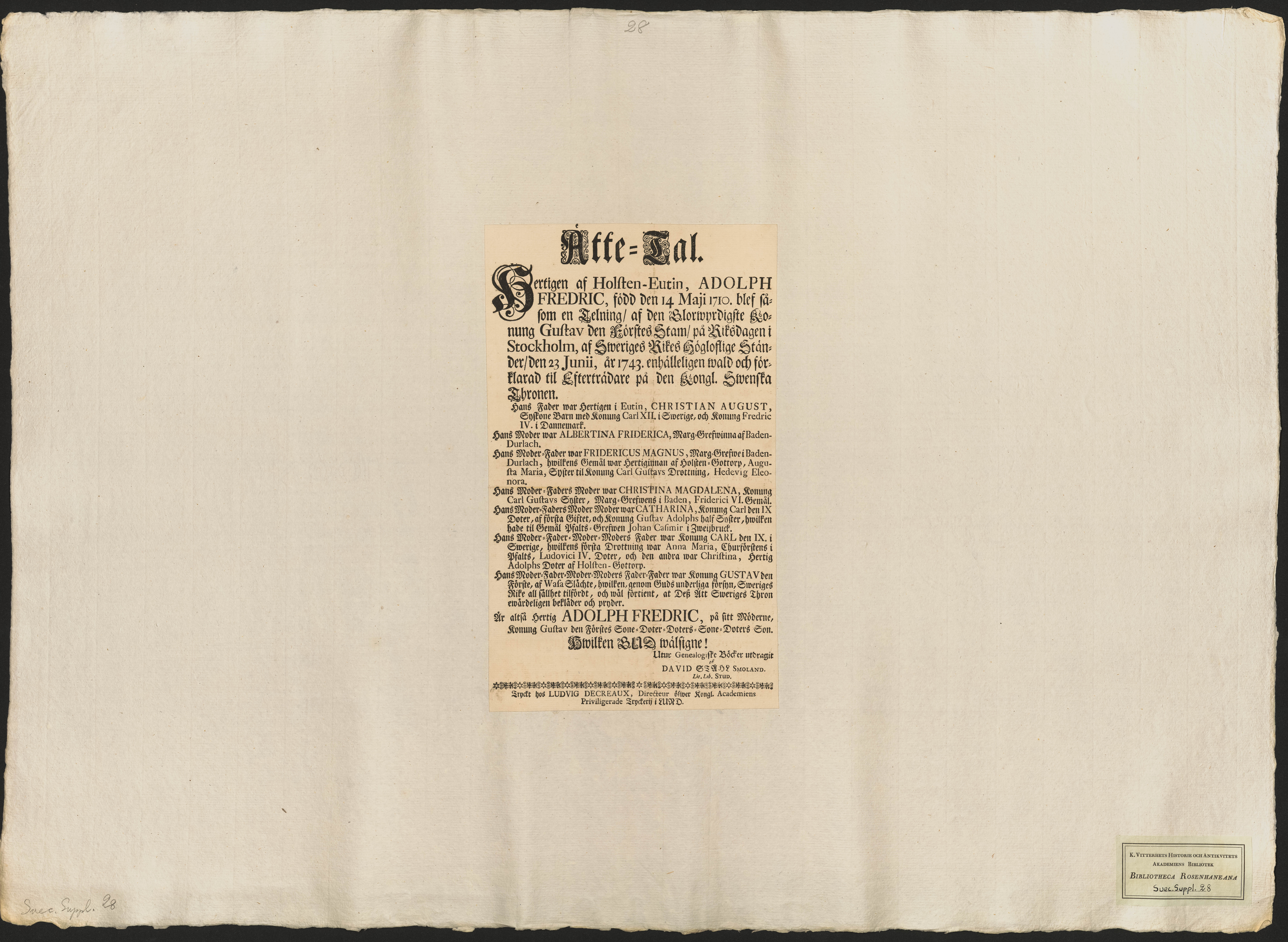 Beskrivning: 1 grafiskt bl. : Kung Adolf Fredriks släkttavla