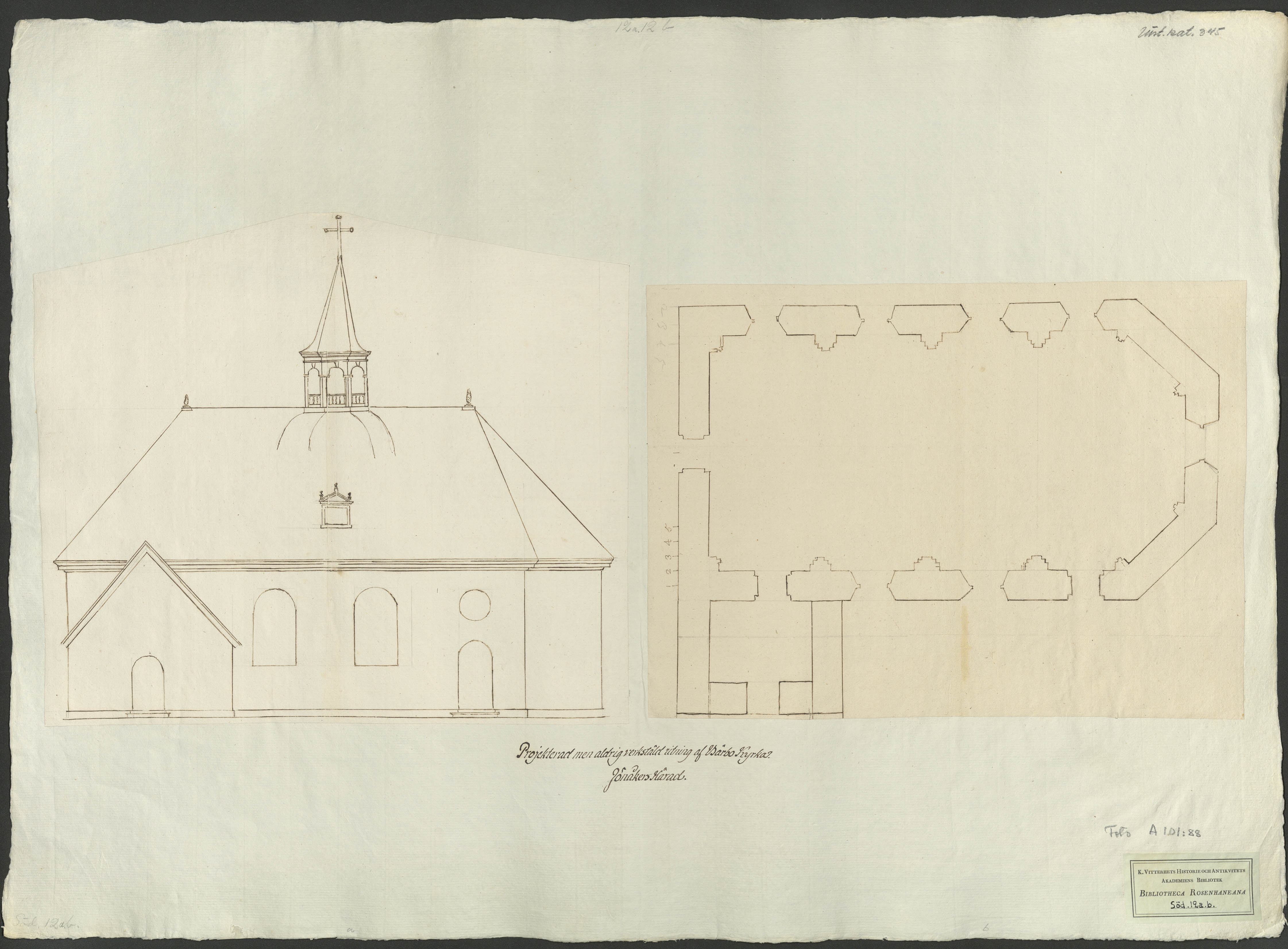 Beskrivning: 2 teckningar : Fasad- samt planritning till Bärbo kyrka.