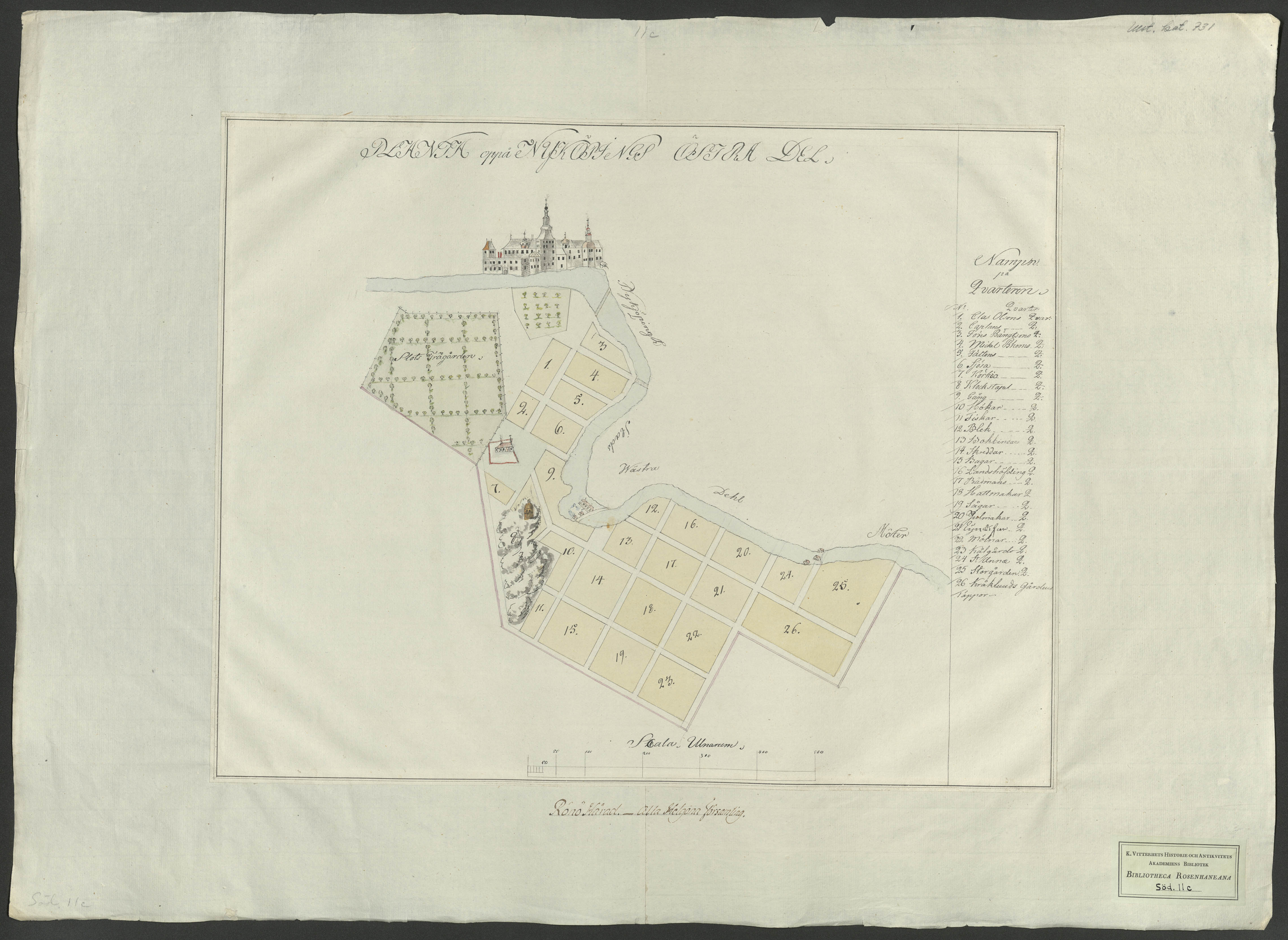 Beskrivning: 1 handritad karta : Stadskarta med numrerade kvarter. Överst slottet i snedperspektiv.