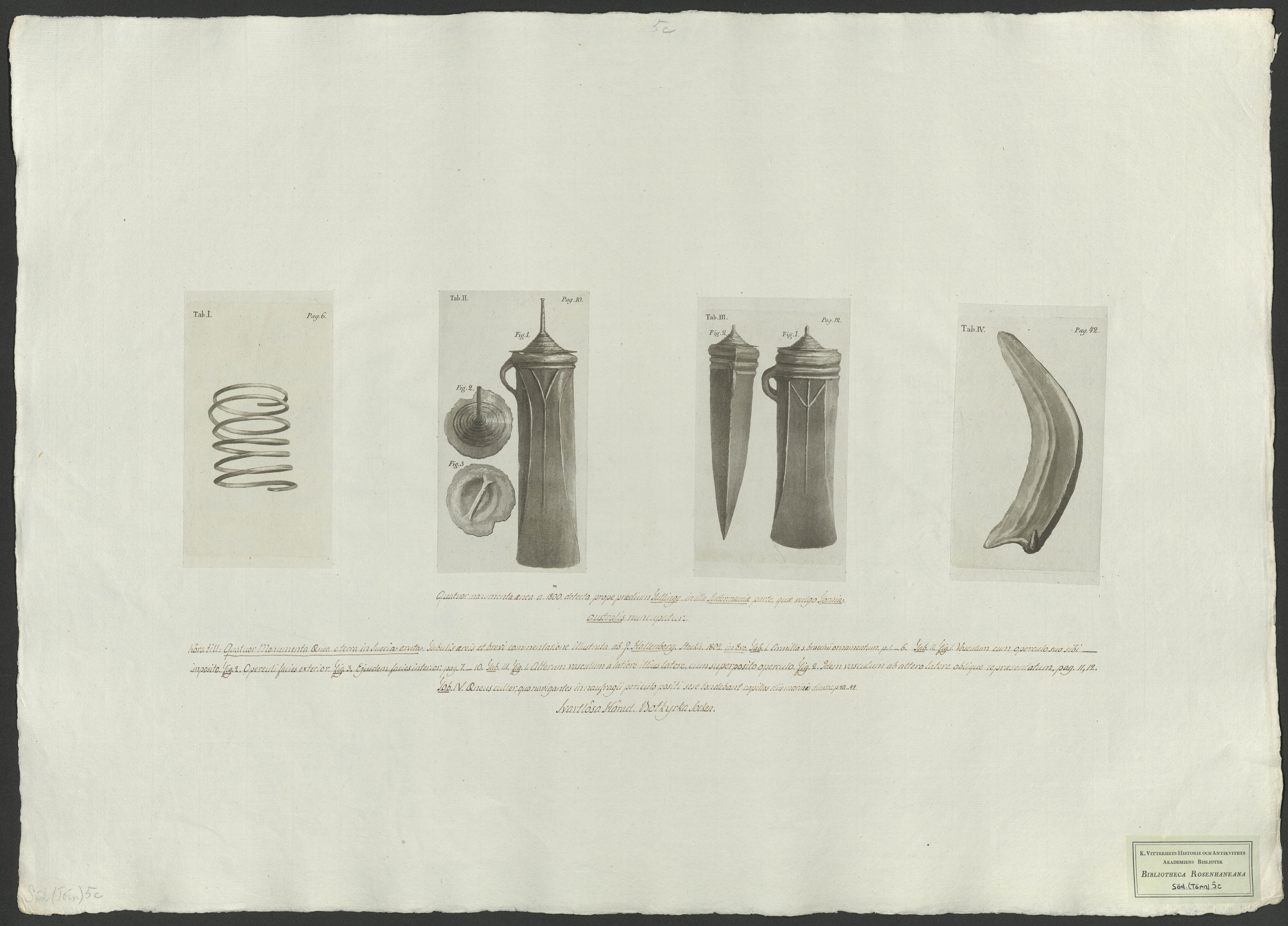 Beskrivning: 4 grafiska bl. : Fyra teckningar av diverse fornfynd av metall.