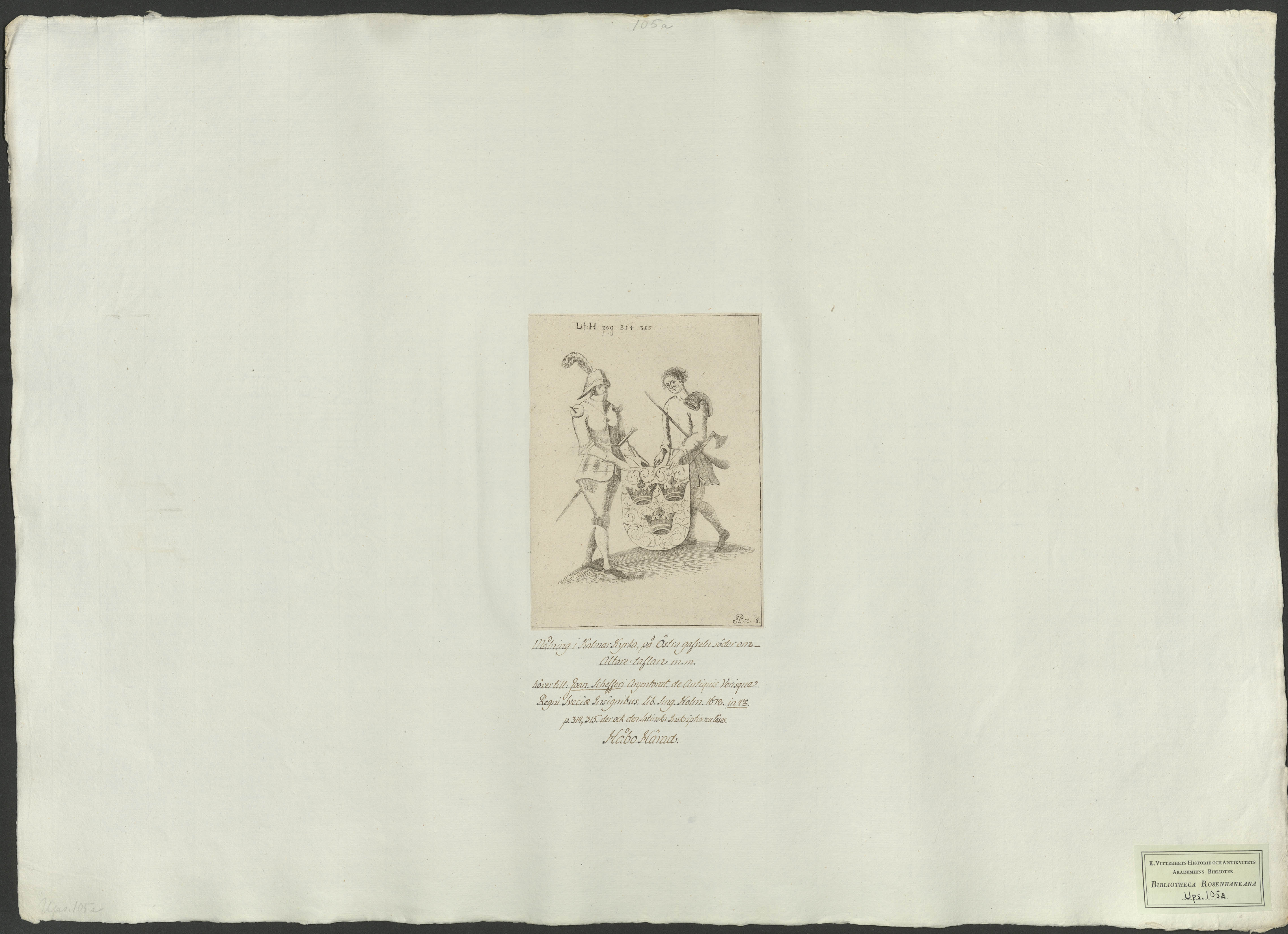 Beskrivning: 1 grafiskt bl. : Tvä män håller en vapensköld med tre kronor mellan sig. I. P. Sc.