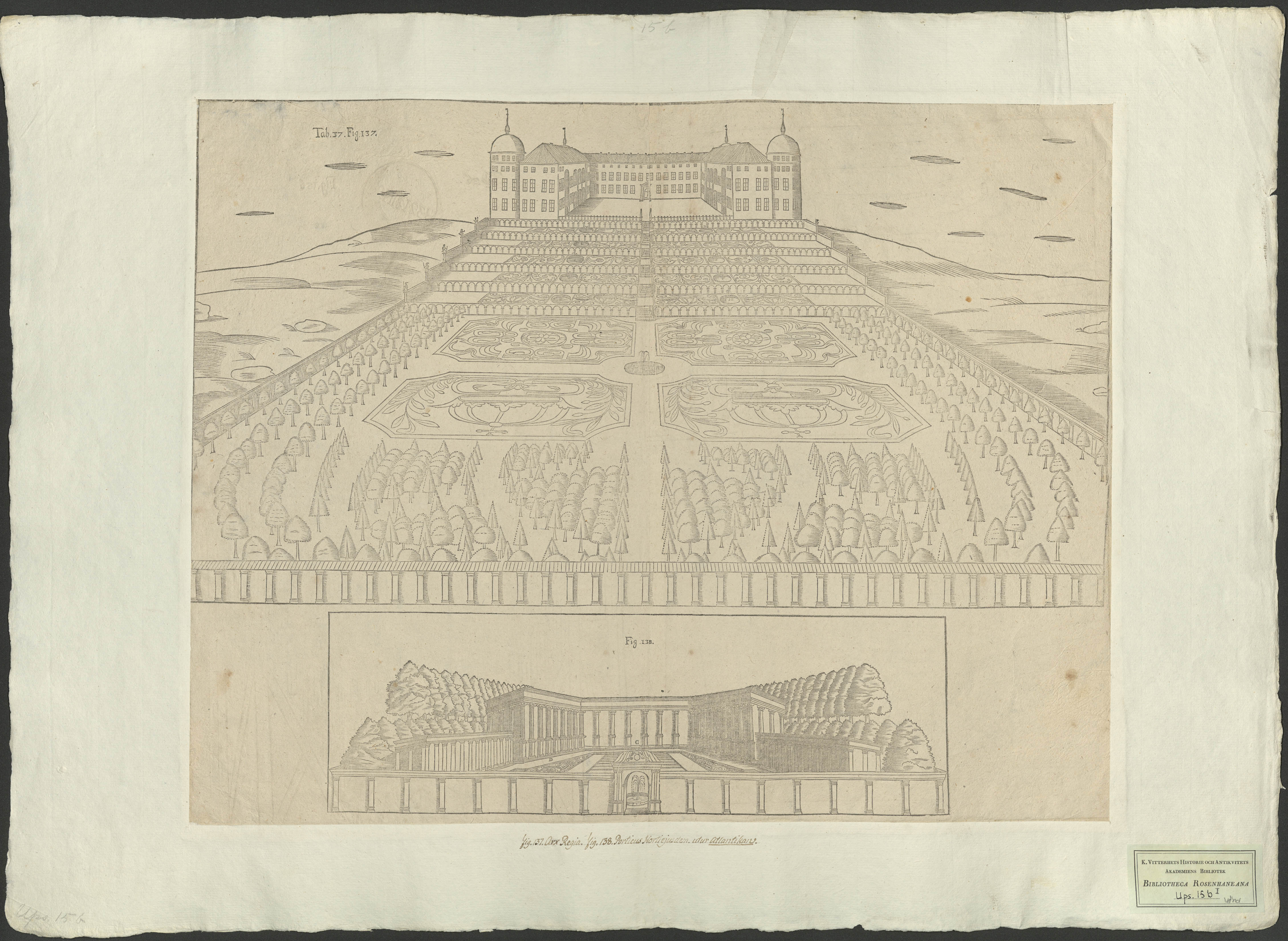 Beskrivning: 1 grafiskt bl. : Perspektivritning över trädgården. I bakgrunden slottet. Därunder en ritning av trädgårdsporten och en fontän.