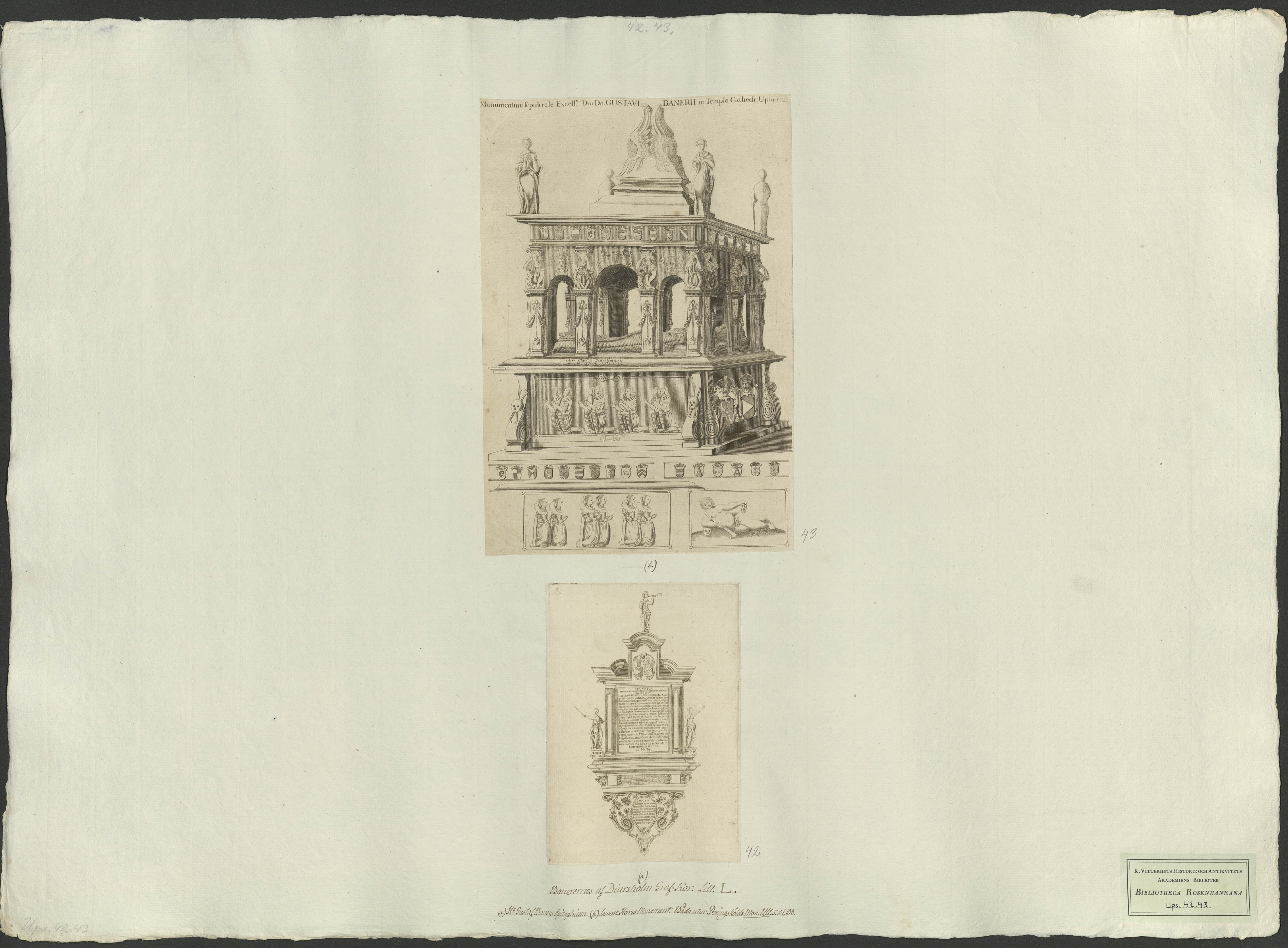 Beskrivning: 1 grafiskt bl. : Gustaf Banérs epitafium i Uppsala domkyrka