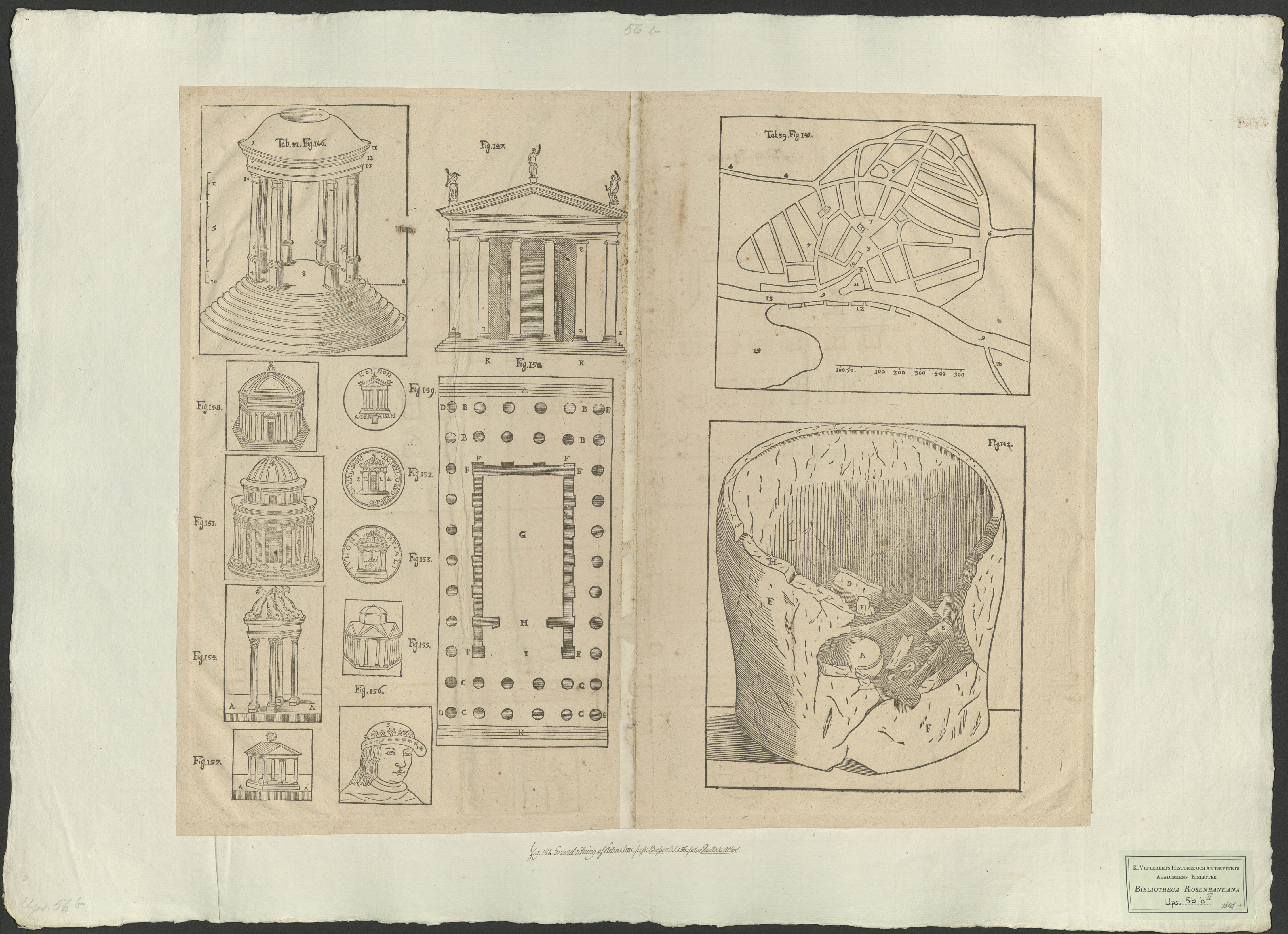 Beskrivning: 1 grafiskt bl. : Bilder på ett antikt tempel, en stadsplan samt ett keramikkärl.