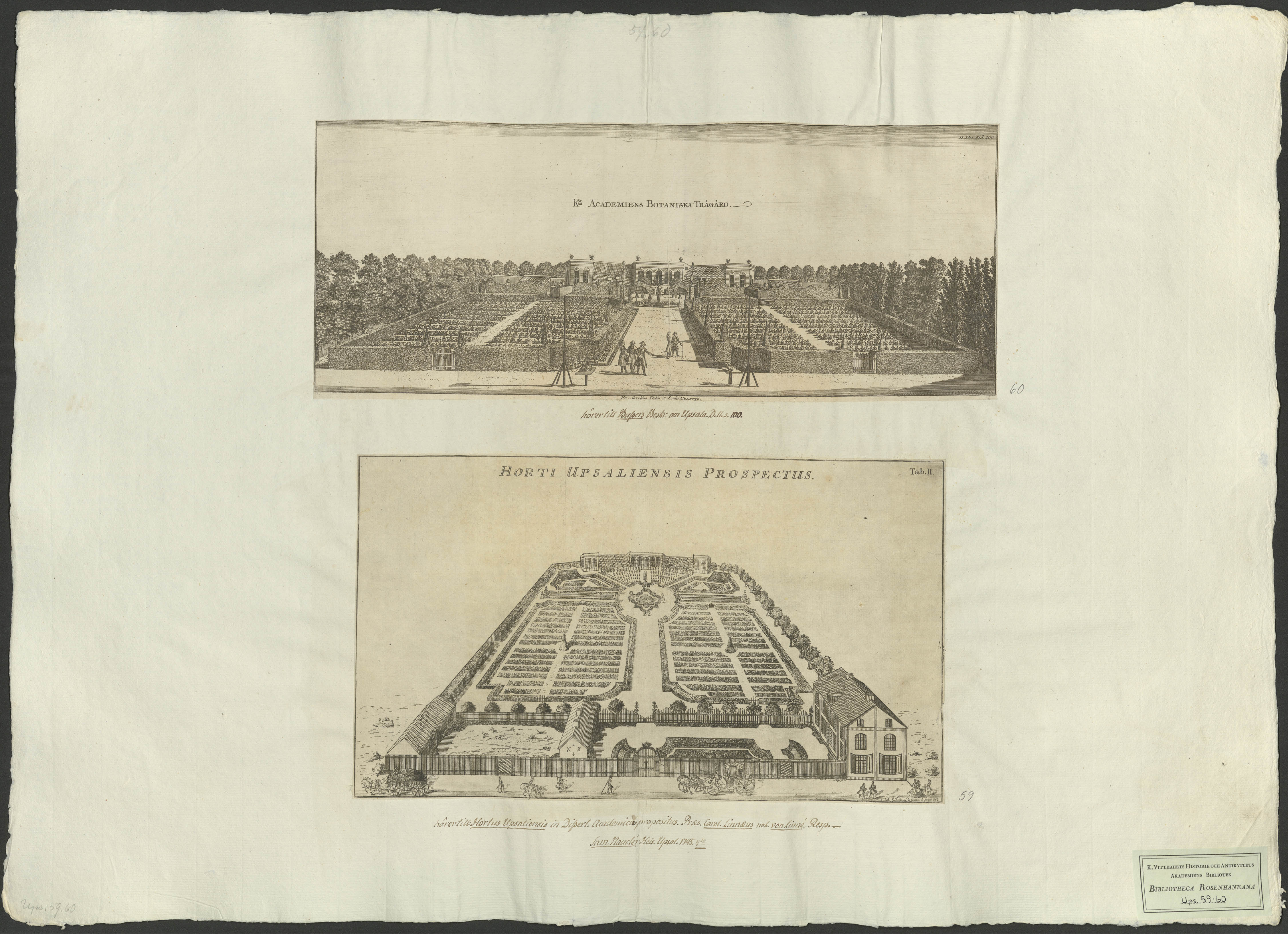 Beskrivning: 1 grafiskt bl. : Perspektivteckning i fågelperspektiv över Linnéträdgården. I förgrunden gatuliv. Joh. G. Hallman delineav. et sculpsit 1745.