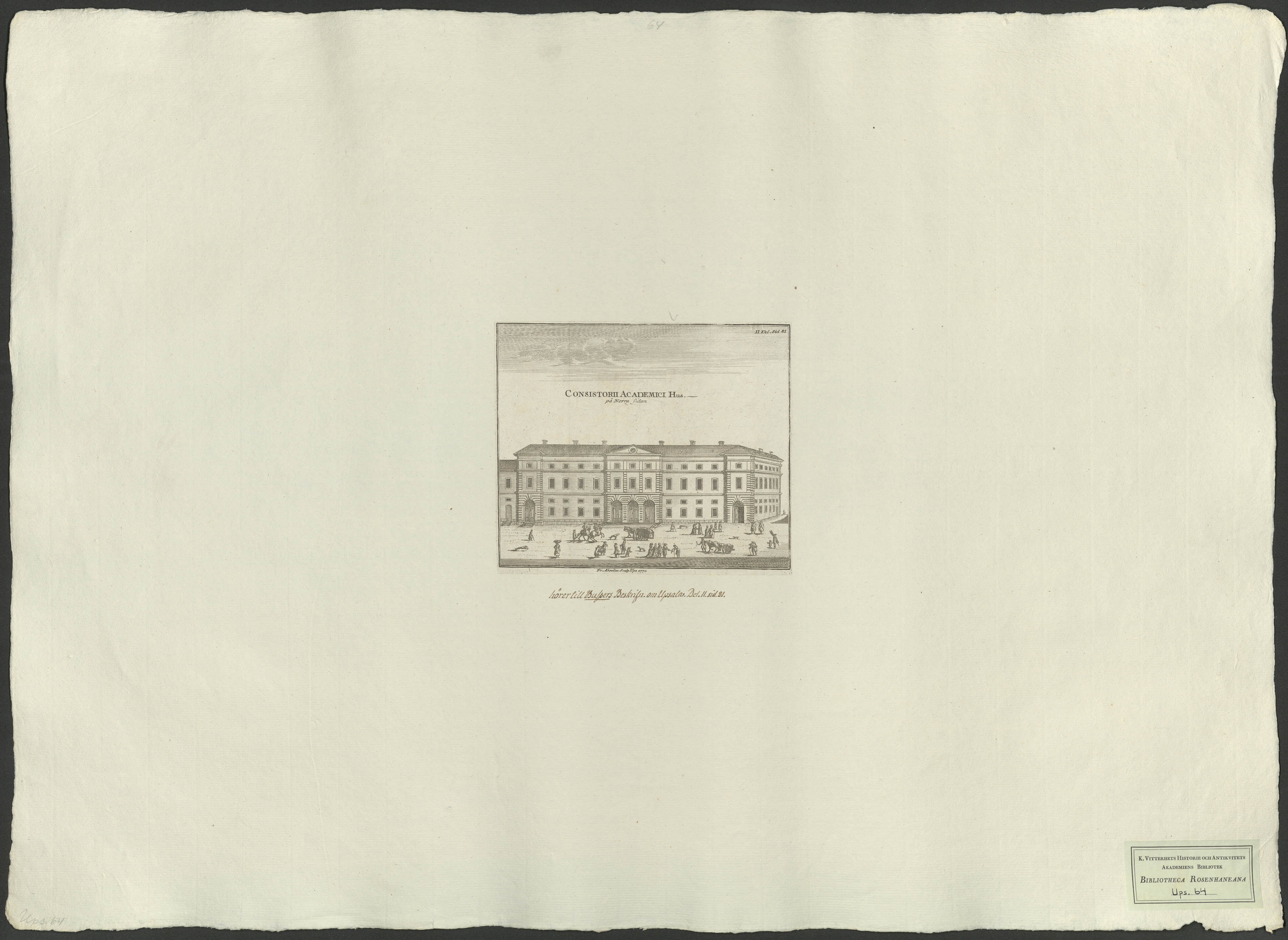 Beskrivning: 1 grafiskt bl. : Gatubild med konstistoriehuset i fonden. Fr. Akrelius sculp Ups. 1770.