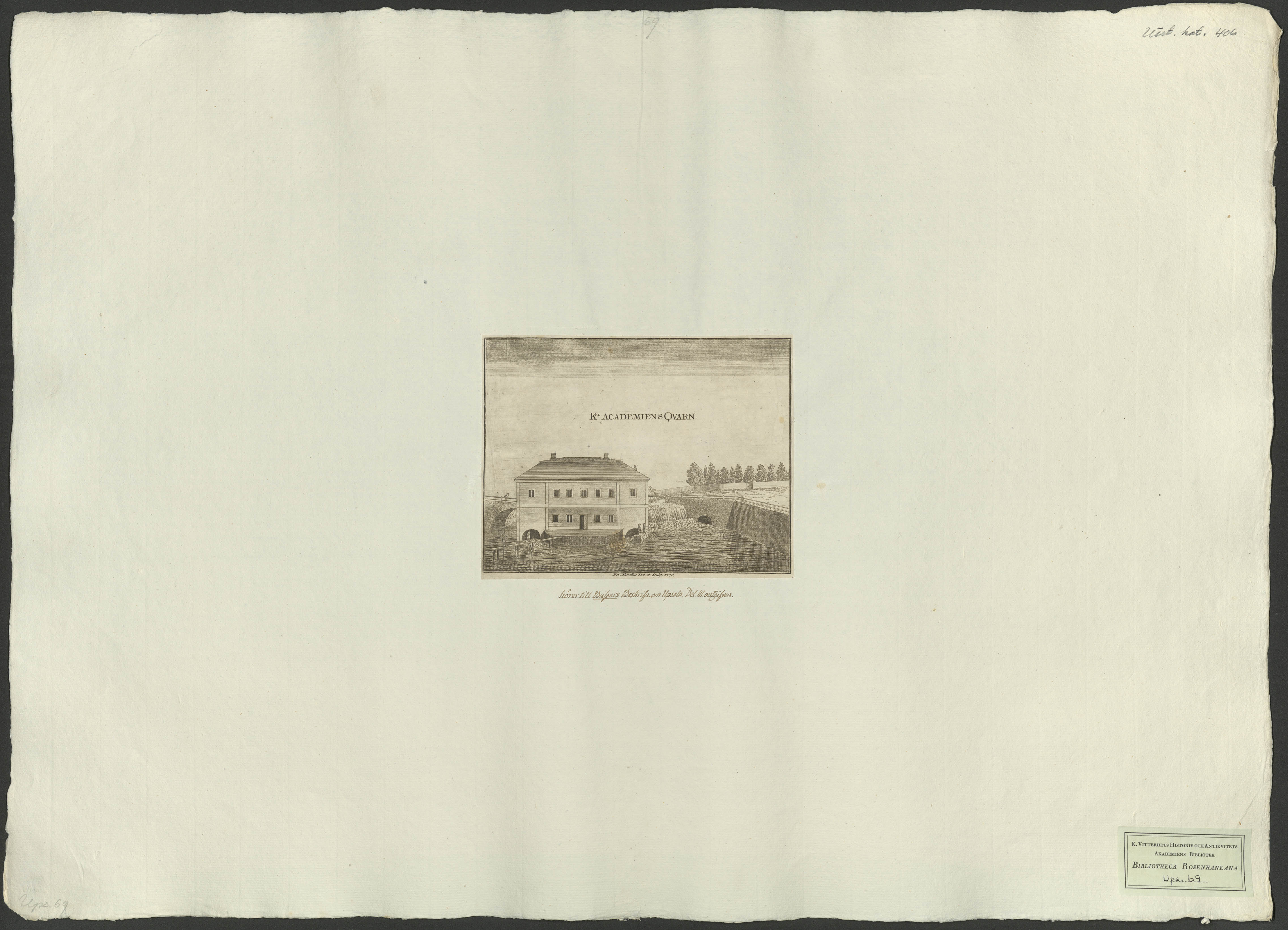 Beskrivning: 1 grafiskt bl. : Perspektivteckning av byggnaden och forsen. Fr. Akrelius del et sculp 1770.