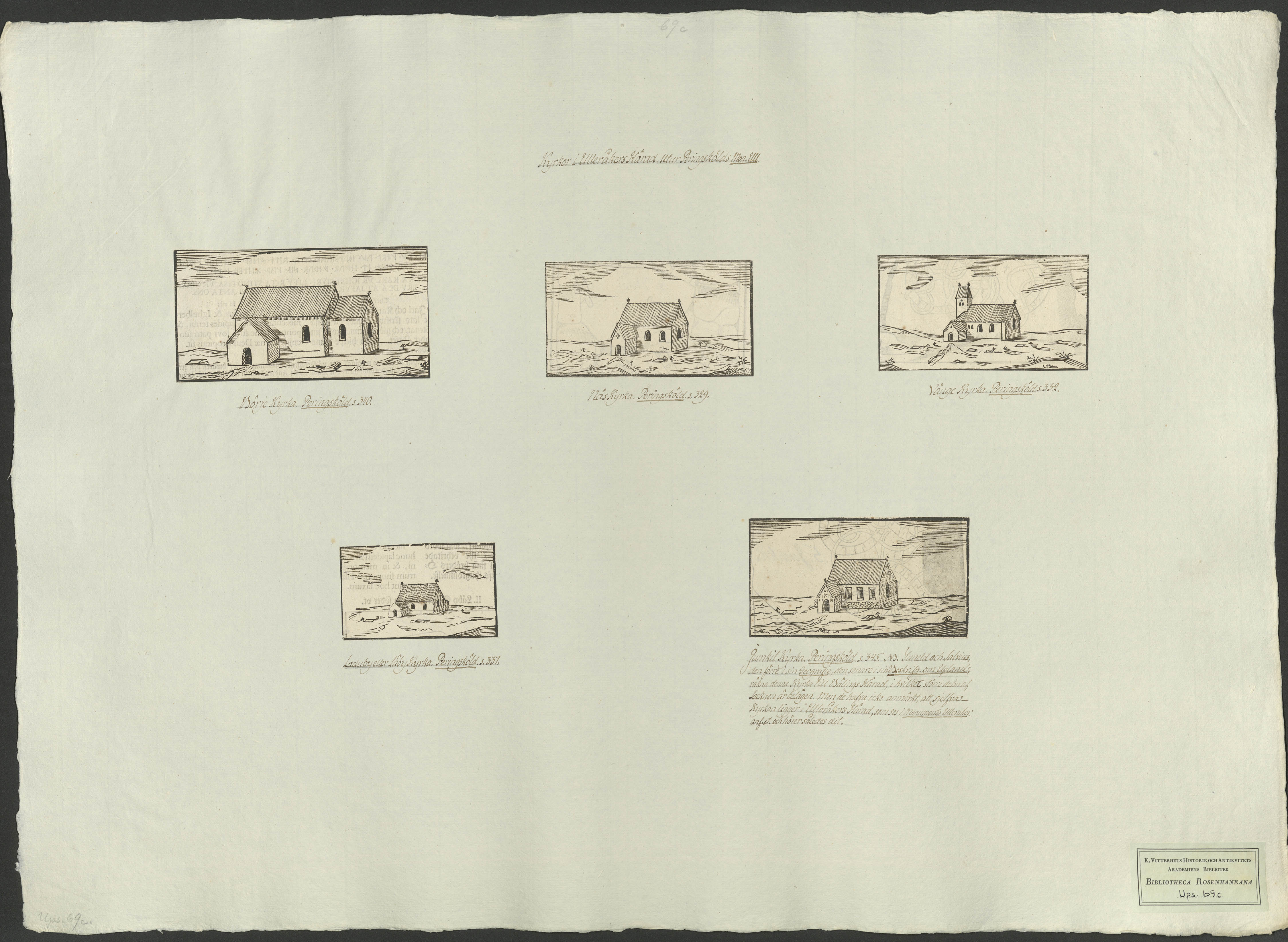 Beskrivning: 1 grafiskt bl. : Fem teckningar av kyrkor: Börje, Näs, Vänge, Läby och Jumkil.