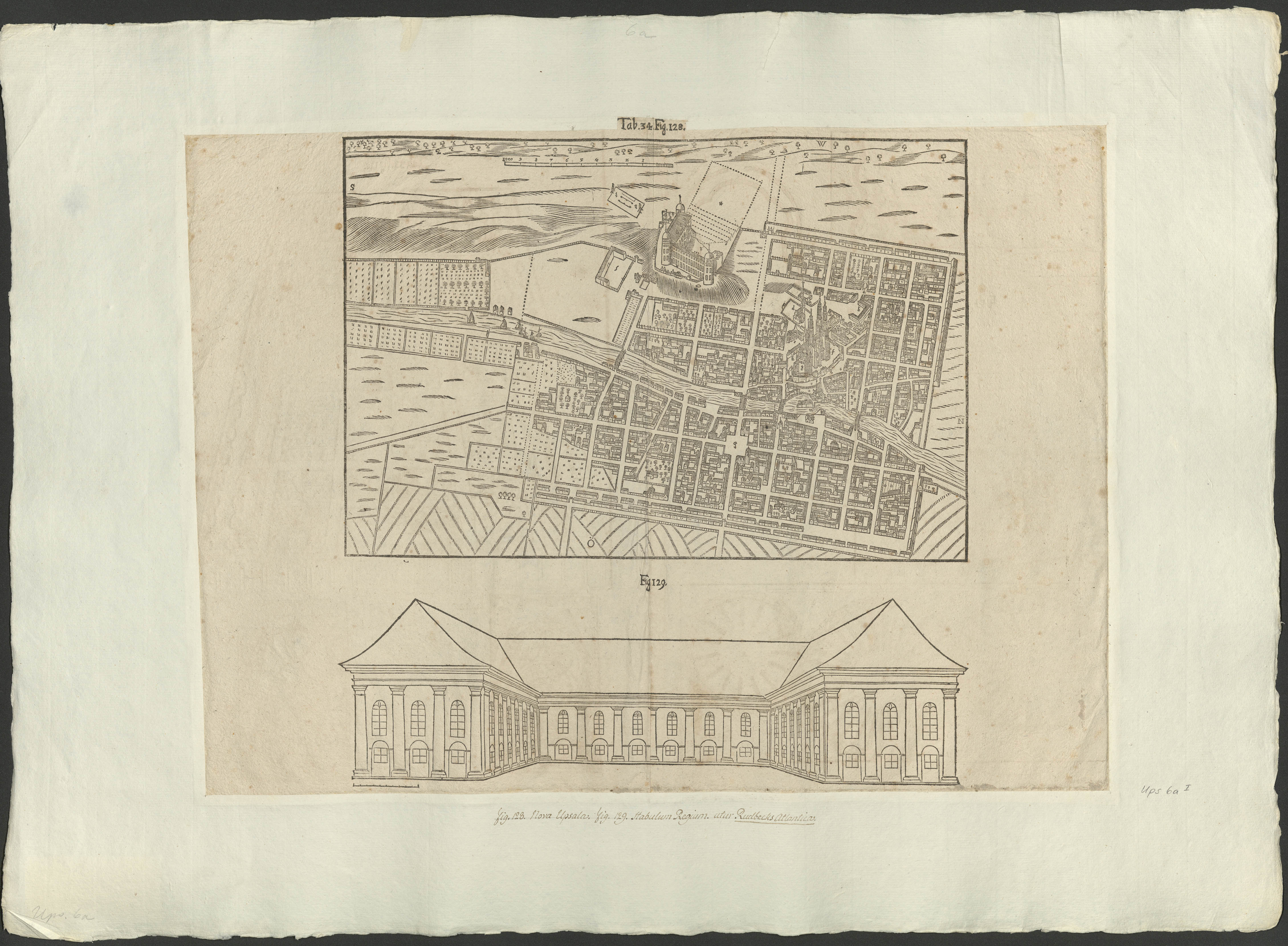 Beskrivning: 1 grafiskt bl. : Stadsplan för Uppsala. Byggnaderna i fågelperspektiv. Ungefärlig skala 1:7000. därunder arkitekturritning av Kungliga stallet.
