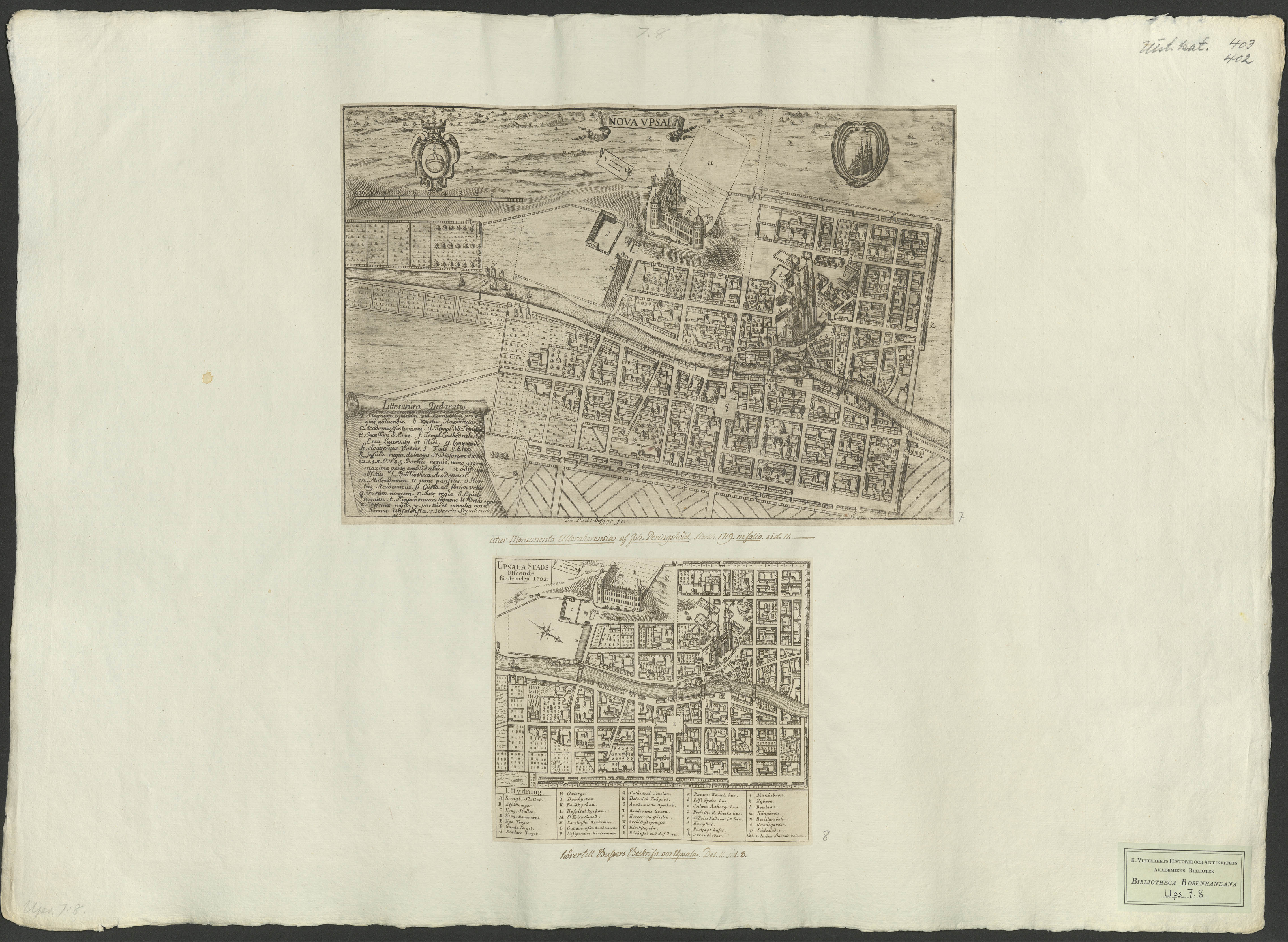 Beskrivning: 1 karta : Stadsplan för Uppsala. Byggnaderna i fågelperspektiv. Ungefärlig skala 1:7000. Dio. Padtbrygge fec.