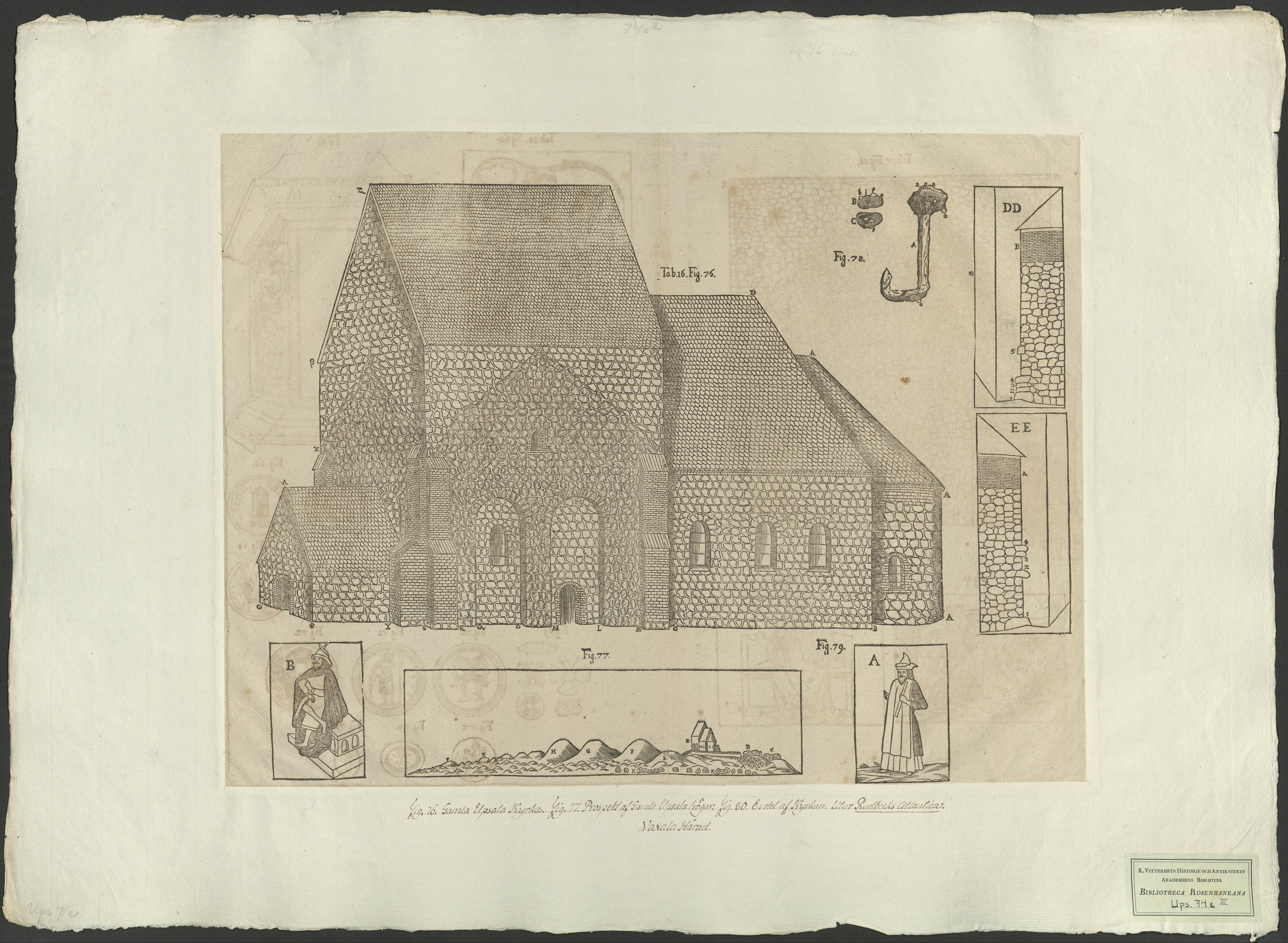 Beskrivning: 1 grafiskt bl. : Kyrkan samt detaljer av konstruktionen m.m. En enkel teckning över Gamla Uppsala med kyrka, storhögar, bebyggelse och gravfält.