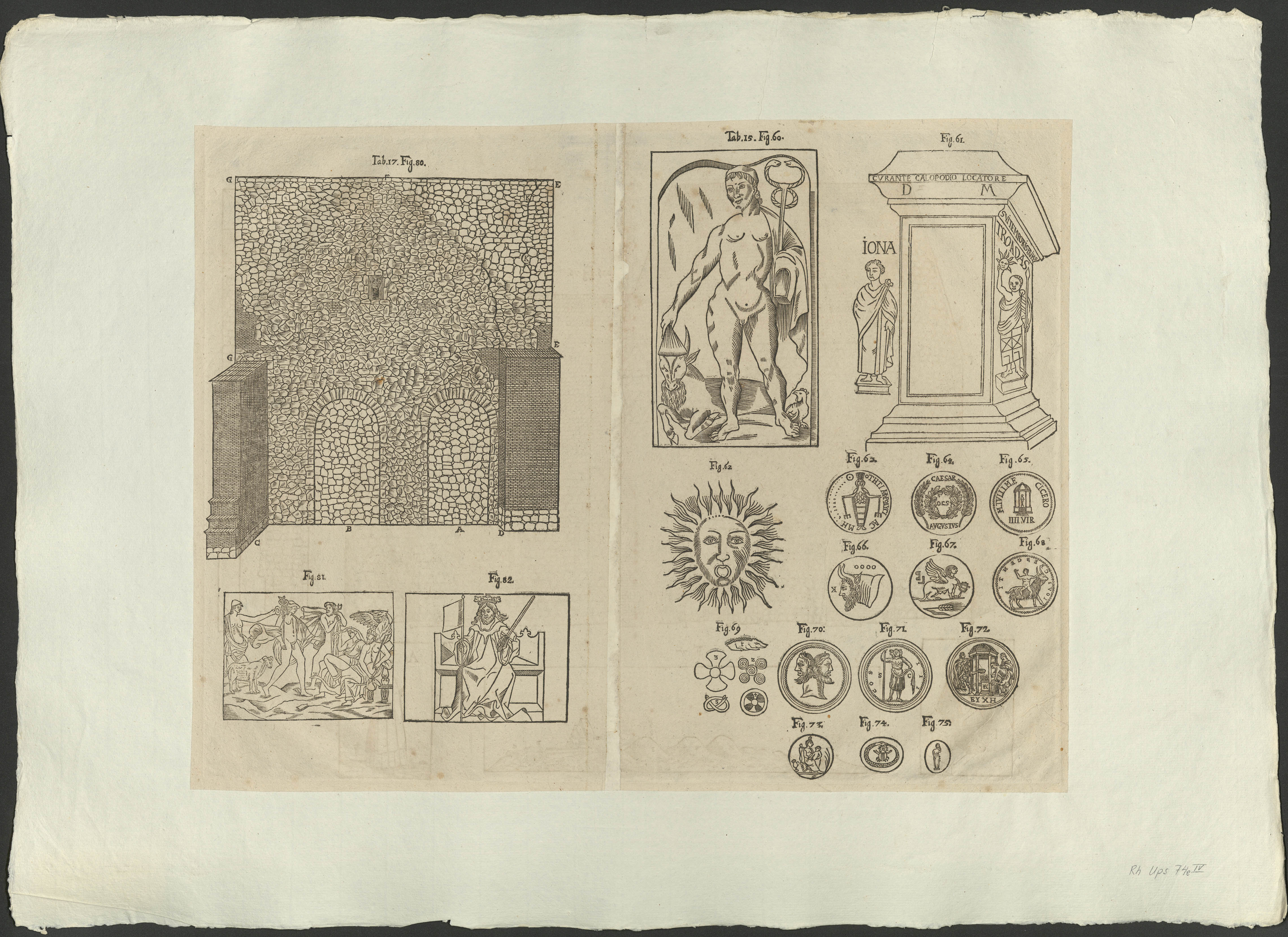 Beskrivning: 1 grafiskt bl. : Detalj av murverk samt diverse mynt etc.