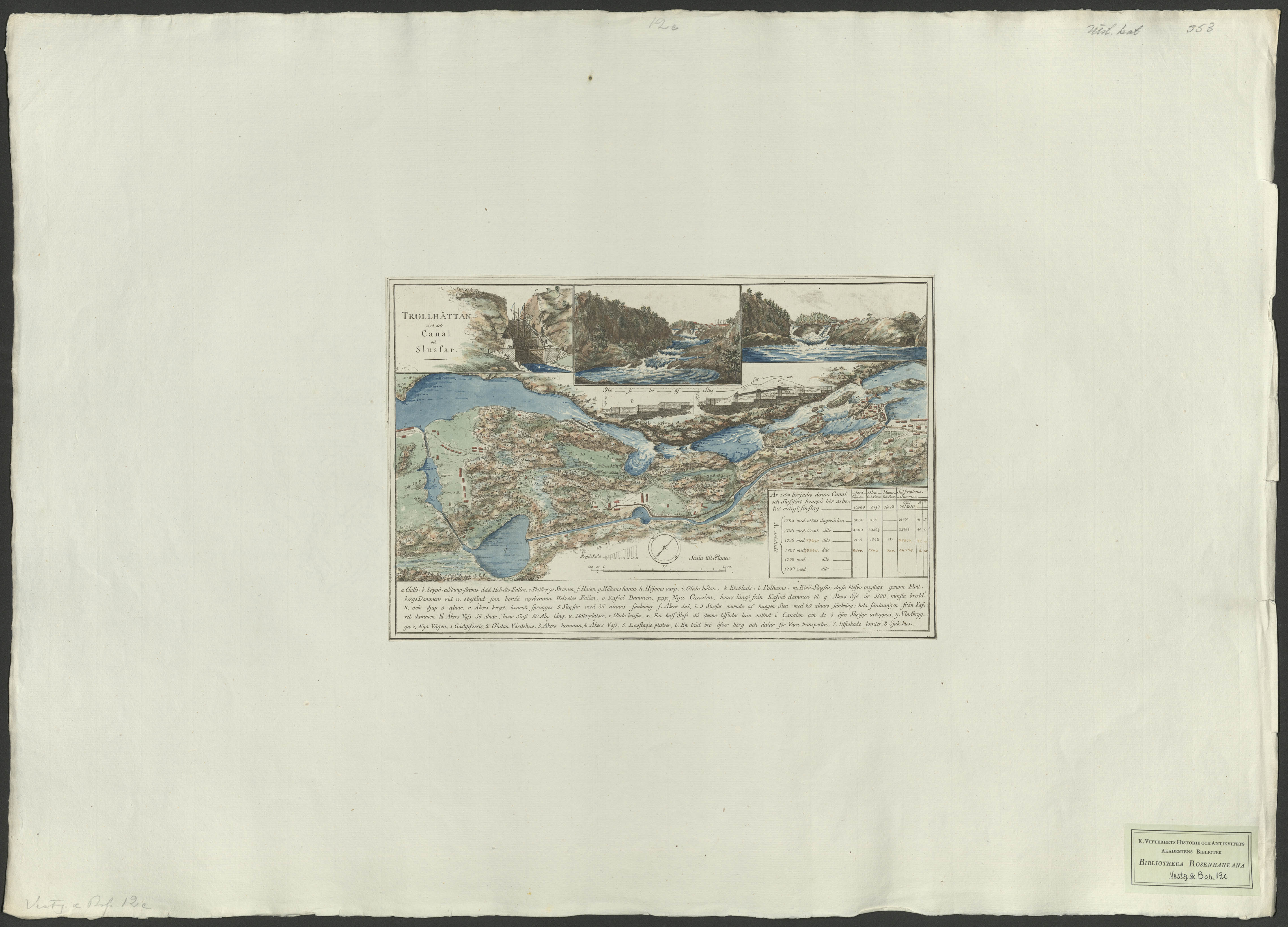 Beskrivning: 1 karta : Överst tre perspektivteckningar över slussar och forsar. Därunder bild i en blandning av lod- och snedperspektiv över kanalområdet. Underst en teckenförklaring. Norr snett upp mot höger. Skala ca 1:8 000.