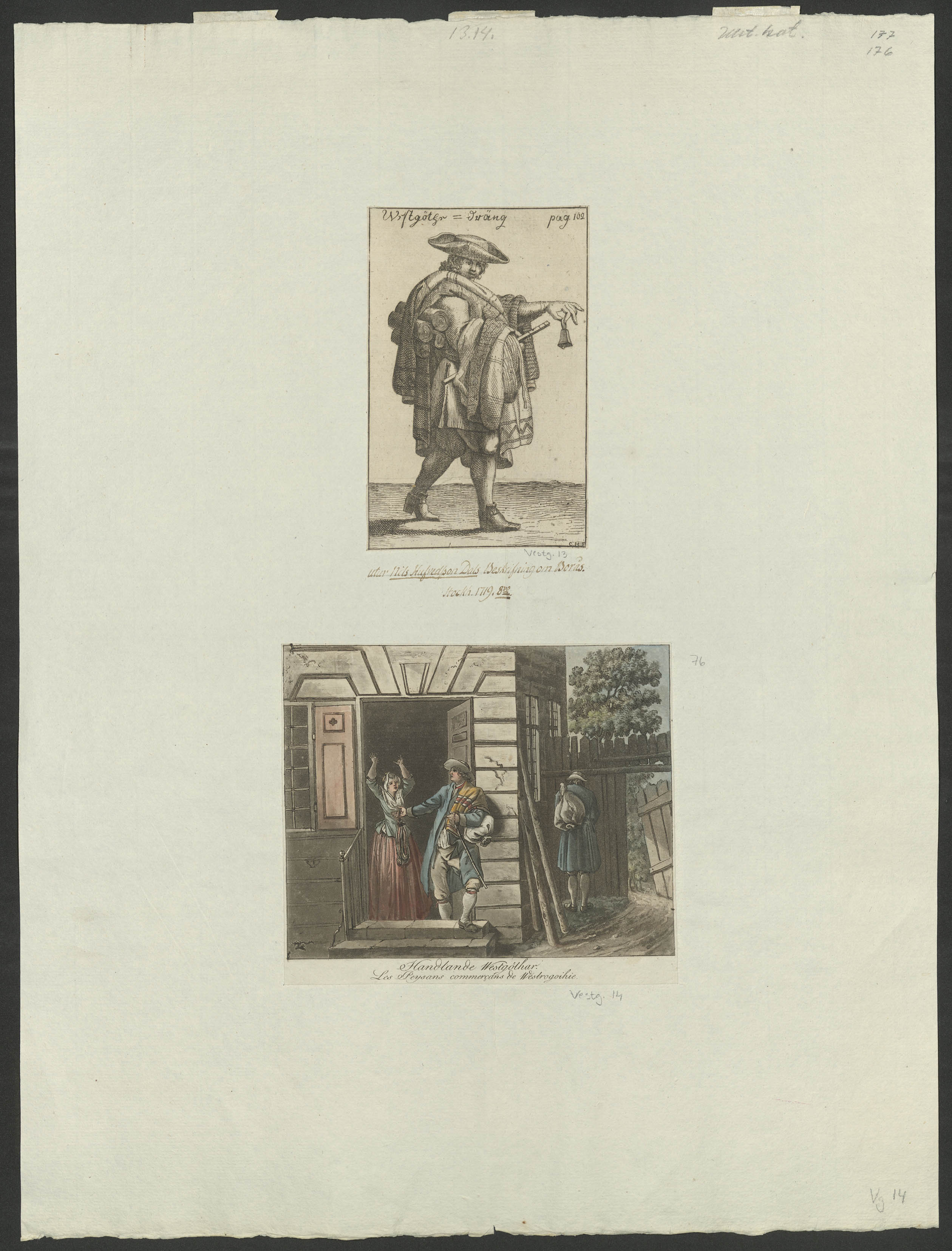 Beskrivning: 1 grafiskt bl. : Gårdfarihandlare med varor på armen. C.H.F.