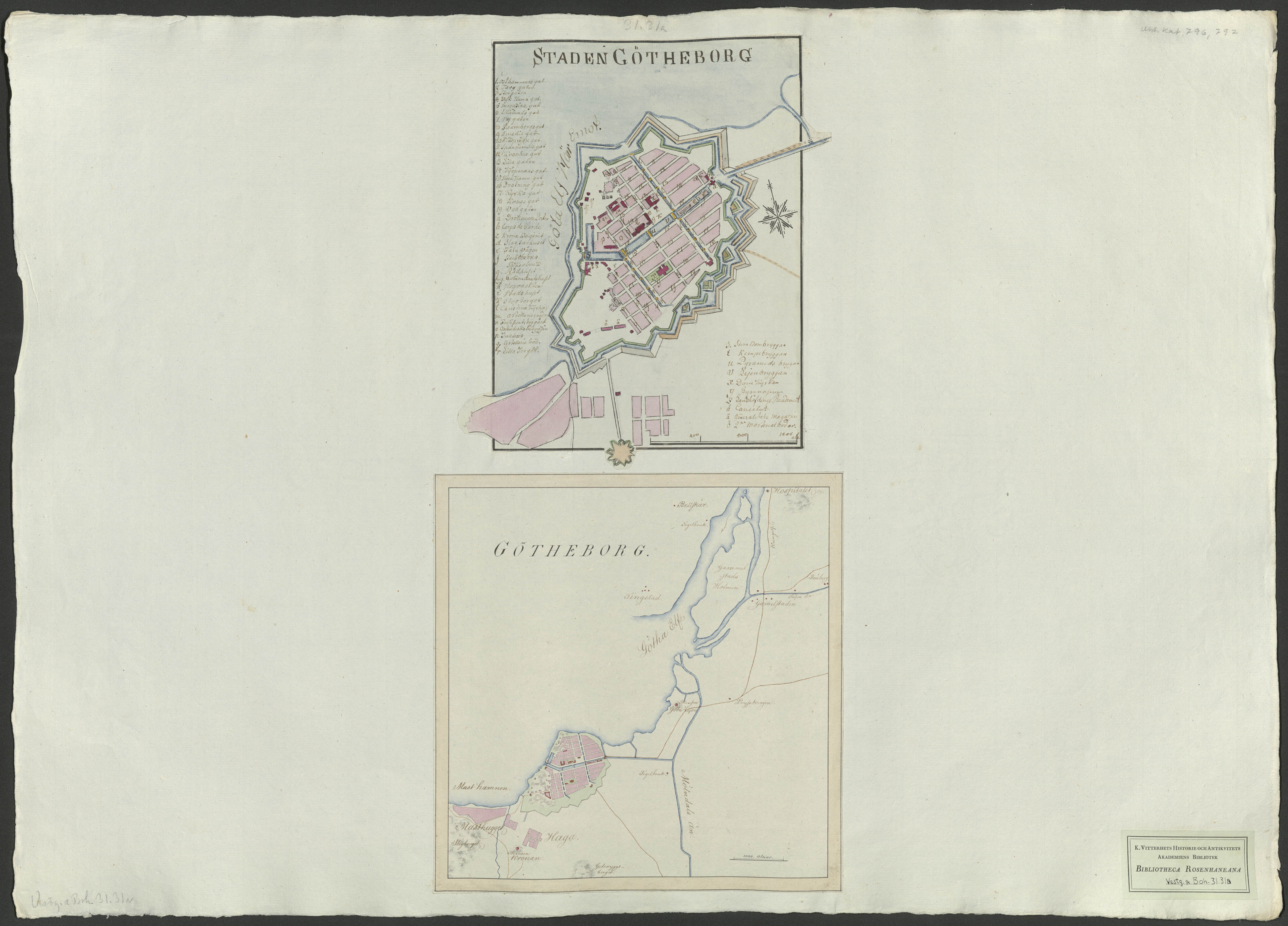 Beskrivning: 1 handritad karta : Visar stadskvarteren och befästningen. Teckenförklaring. Norr något snett upp mot vänster.