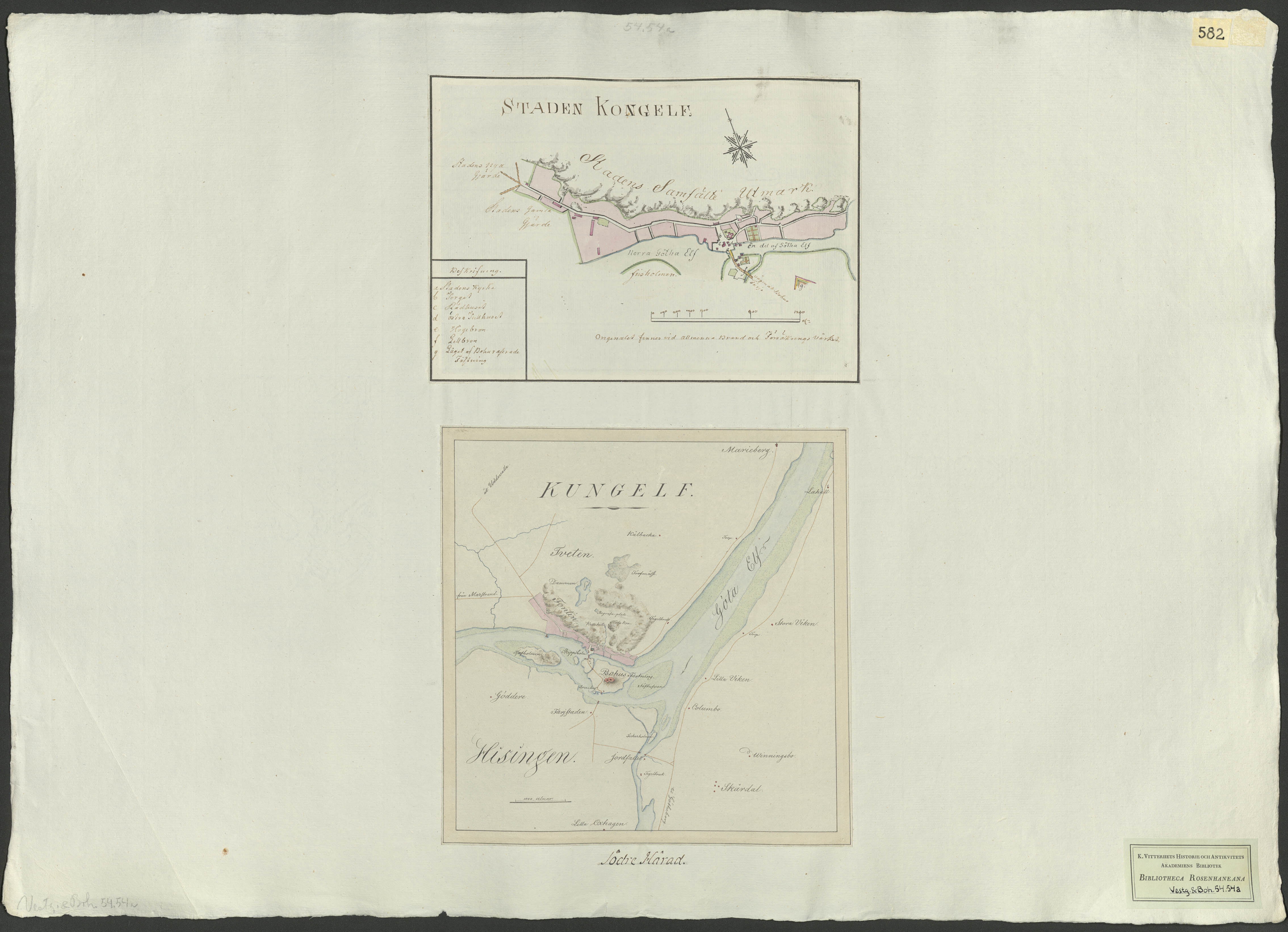 Beskrivning: 1 handritad karta : Visar staden med kvarter och gator. Teckenförklaring. Nordpil.