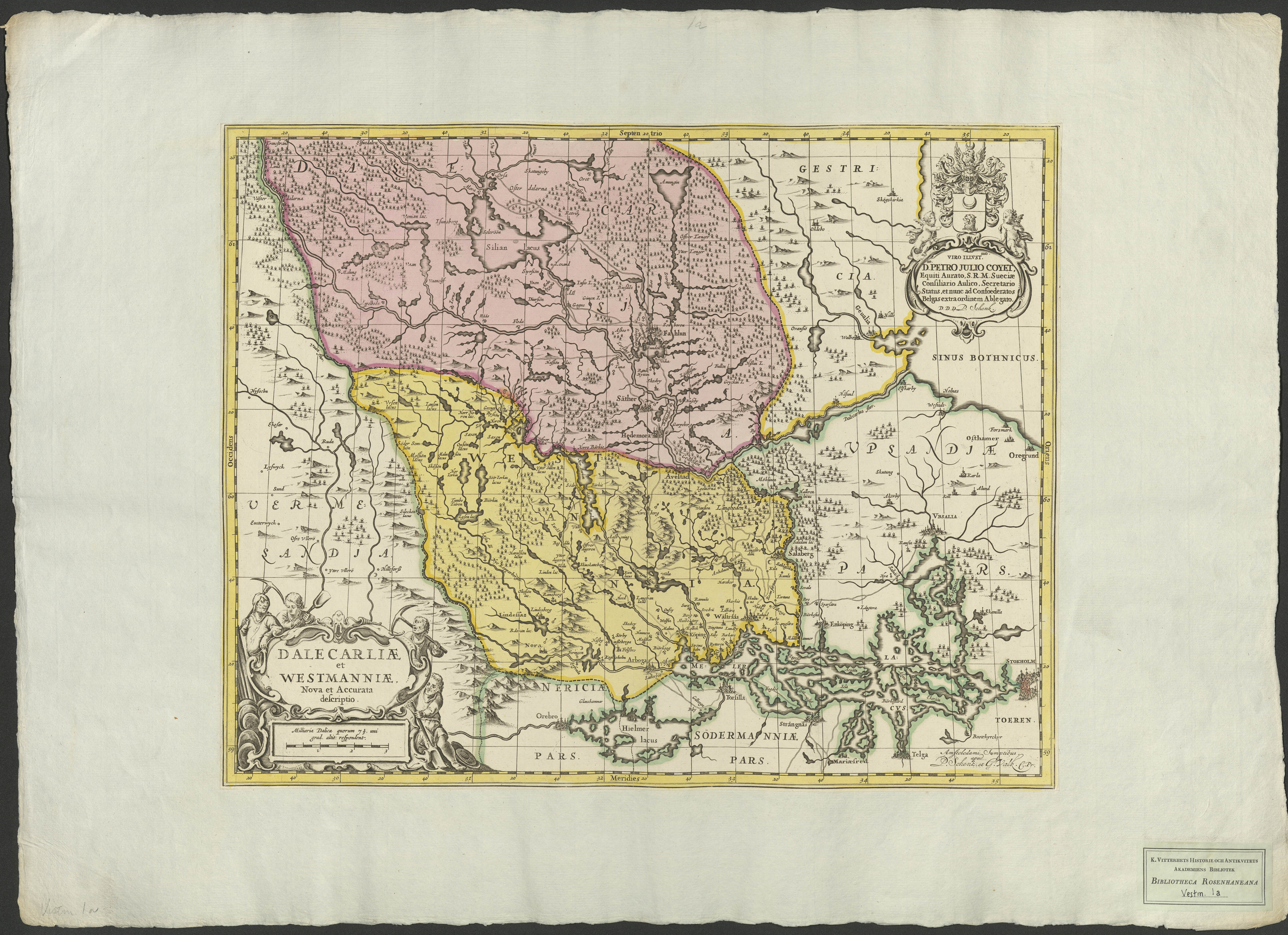 Beskrivning: 1 karta : Karta över Västmanland samt del av Dalarna. Landskapsgränser och -ytor kolorerade. Amstelodami sumptibus apud P. Schenk et G. Valk C.pr
