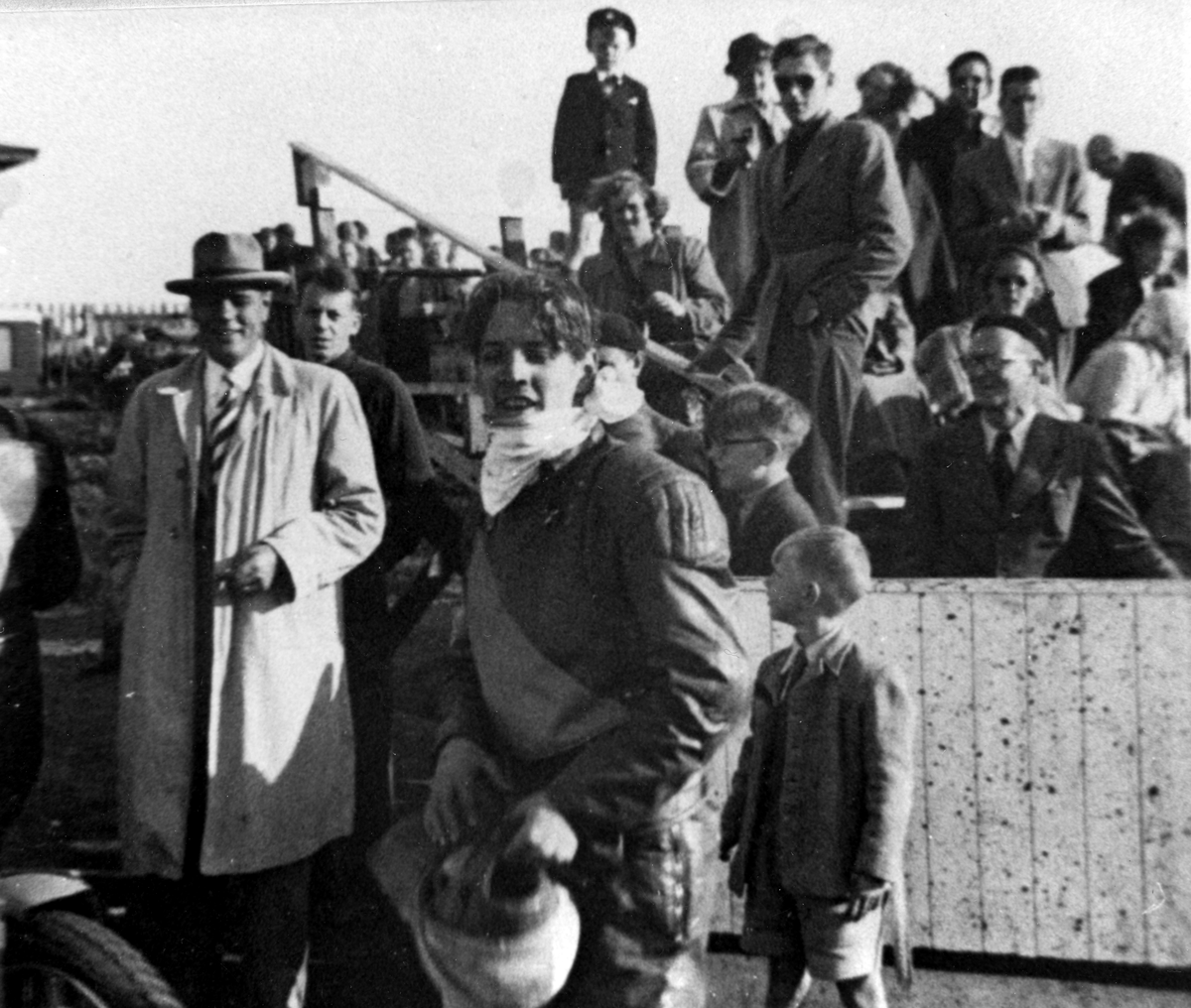 Per-Tage Svensson i full mundering. Mannen t.v. i hatt är Tage Andersson, Arkivator. Bakom planket i basker Sigge Johansson (Per-Tages svärfar och arbetsgivare).
