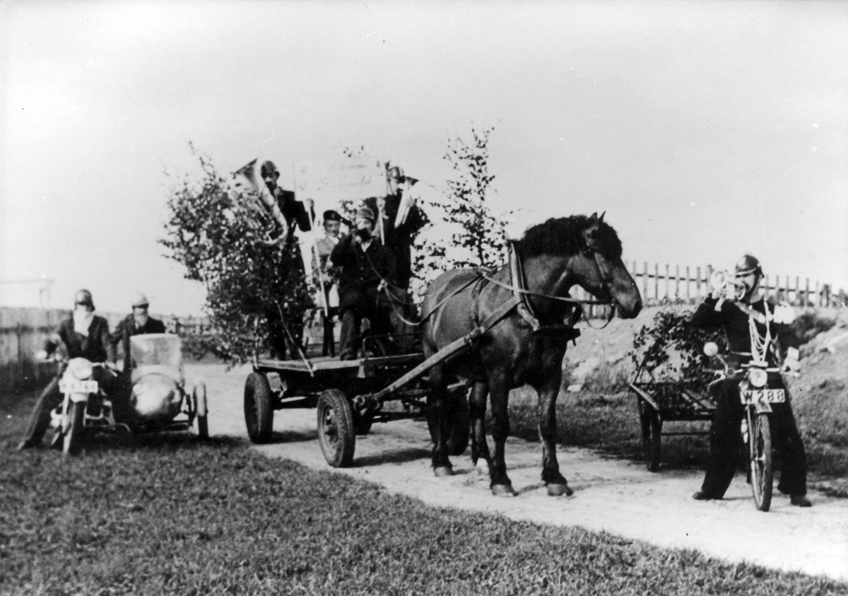 Arvid Hardemans 50-årsdag. Efter att ha blivit körd till motorbanan på en cykelkärra flyttades han över till en lövad hästsjuts.