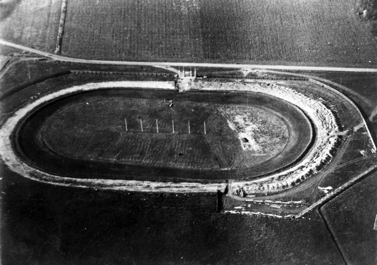 Flygbild över motorbanan under byggnad, i maj 1949. Vägen brevid är gamla Åslevägen, numera en del av Holländergatan.