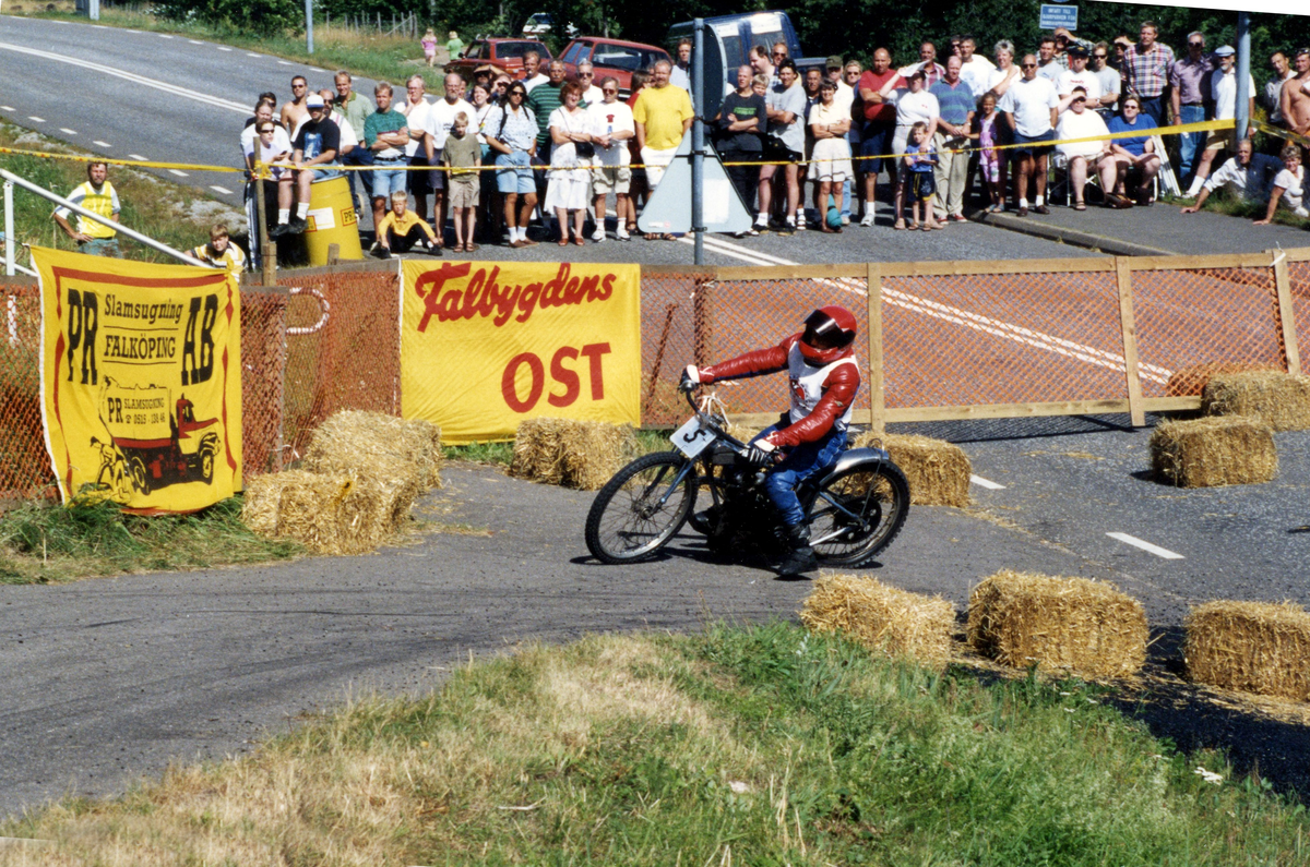 Titel: Scheelebacken 1997 - 50 år efter de ursprungliga backtävlingarna. Arne Lind, Borlänge, på en Huskvarna 1929.