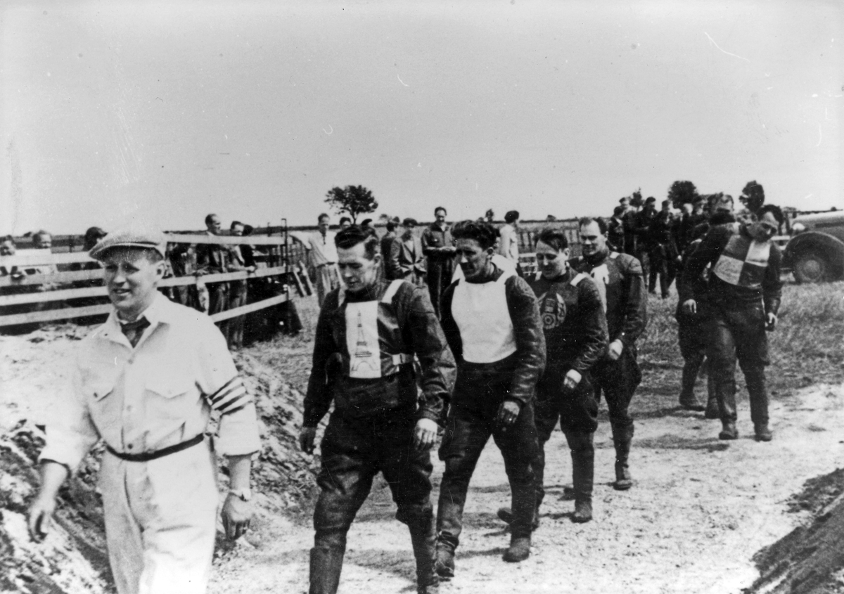 Depåchef Mats Josefsson leder in förarna på banan för en presentation. Bill Harris, England; Kurt Lindholm, Kumla; Bertil Karlsson, Monarkerna; Linus Eriksson, Filbyterna; Ragnar "Ragge" Friberg, Gema. 19/6 1949.