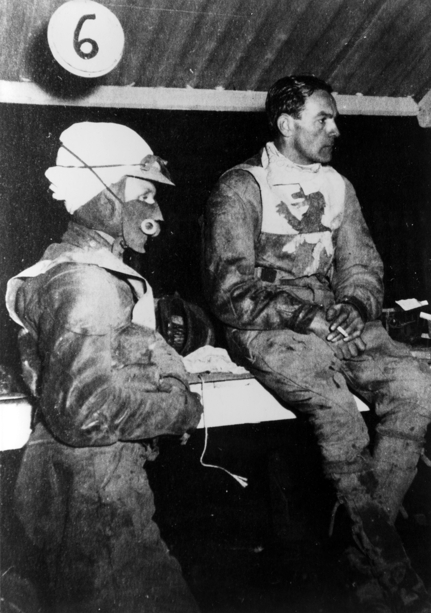 Lasse Thaug, Dackarna Växjö, stärker sig med ett bloss före nästa heat. Personen t.v. okänd. 22/10 1950.